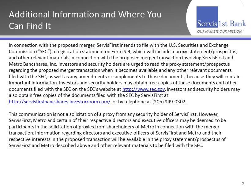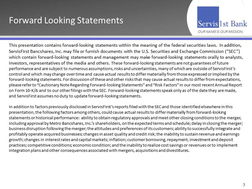Additional Information and Where You Can Find It In connection with the proposed merger, ServisFirst intends to file with the U.S. Securities and Exchange Commission (“SEC”) a registration statement on Form S - 4, which will include a proxy statement/prospectus, and other relevant materials in connection with the proposed merger transaction involving ServisFirst and Metro Bancshares, Inc. Investors and security holders are urged to read the proxy statement/prospectus regarding the proposed merger transaction when it becomes available and any other relevant documents filed with the SEC, as well as any amendments or supplements to those documents, because they will contain Important information. Investors and security holders may obtain free copies of these documents and other documents filed with the SEC on the SEC’s website at http://www.sec.gov . Investors and security holders may also obtain free copies of the documents filed with the SEC by ServisFirst at http://servisfirstbancshares.investorroom.com/ , or by telephone at (205) 949 - 0302. This communication is not a solicitation of a proxy from any security holder of ServisFirst . However, ServisFirst , Metro and certain of their respective directors and executive officers may be deemed to be participants in the solicitation of proxies from shareholders of Metro in connection with the merger transaction. Information regarding directors and executive officers of ServisFirst and Metro and their respective interests in the proposed transaction will be available in the proxy statement/prospectus of ServisFirst and Metro described above and other relevant materials to be filed with the SEC. OUR NAME IS OUR MISSION. 2