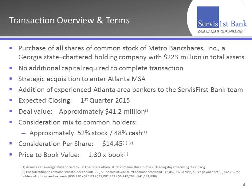 Forward Looking Statements This presentation contains forward - looking statements within the meaning of the federal securities laws. In addition, ServisFirst Bancshares, Inc. may file or furnish documents with the U.S. Securities and Exchange Commission (“SEC”) which contain forward - looking statements and management may make forward - looking statements orally to analysts, investors , representatives of the media and others. These forward - looking statements are not guarantees of future performance and are subject to numerous assumptions, risks and uncertainties, many of which are outside of ServisFirst’s control and which may change over time and cause actual results to differ materially from those expressed or implied by the forward - looking statements. For discussion of these and other risks that may cause actual results to differ from expectations, please refer to “Cautionary Note Regarding Forward - looking Statements” and “Risk Factors” in our most recent Annual Report on Form 10 - K/A and to our other filings with the SEC. Forward - looking statements speak only as of the date they are made, and ServisFirst assumes no duty to update forward - looking statements. In addition to factors previously disclosed in ServisFirst’s reports filed with the SEC and those identified elsewhere in this presentation, the following factors among others, could cause actual results to differ materially from forward - looking statements or historical performance: ability to obtain regulatory approvals and meet other closing conditions to the merger , including approval by Metro Bancshares, Inc.’s shareholders, on the expected terms and schedule; delay in closing the merger; business disruption following the merger; the attitudes and preferences of its customers; ability to successfully integrate a nd profitably operate acquired businesses; changes in asset quality and credit risk; the inability to sustain revenue and earnin gs growth; changes in interest rates and capital markets; inflation; customer borrowing, repayment, investment and deposit practices; competitive conditions; economic condition; and the inability to realize cost savings or revenues or to implement integration plans and other consequences associated with mergers, acquisitions and divestitures. OUR NAME IS OUR MISSION. 3