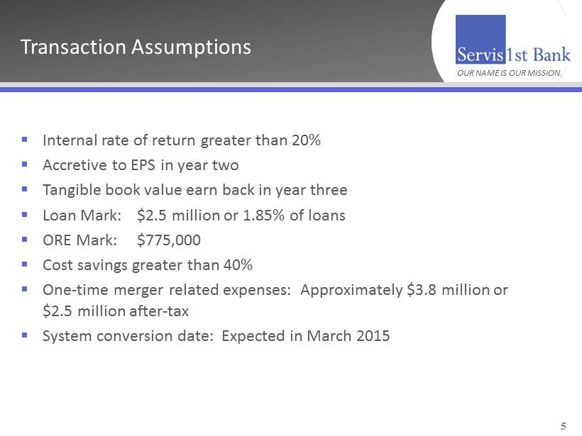 Transaction Overview & Terms ▪ Purchase of all shares of common stock of Metro Bancshares, Inc., a Georgia state – chartered holding company with $ 223 million in total assets ▪ No additional capital required to complete transaction ▪ Strategic acquisition to enter Atlanta MSA ▪ Addition of experienced Atlanta area bankers to the ServisFirst Bank team ▪ Expected Closing: 1 st Quarter 2015 ▪ Deal value: Approximately $41.2 million (1) ▪ Consideration mix to common holders: – Approximately 52% stock / 48% cash (1) ▪ Consideration Per Share: $14.45 (1) (2) ▪ Price to Book Value: 1.30 x book (1) (1) Assumes an average stock price of $28.83 per share of ServisFirst common stock for the 20 trading days preceding the closing. (2) Consideration to common stockholders equals 636,720 shares of ServisFirst common stock and $17,082,737 in cash, plus a payment of $5,742,262 for holders of options and warrants (636,720 x $28.83 + $17,082,737 + $5,742,262 = $41,181,638) OUR NAME IS OUR MISSION. 4