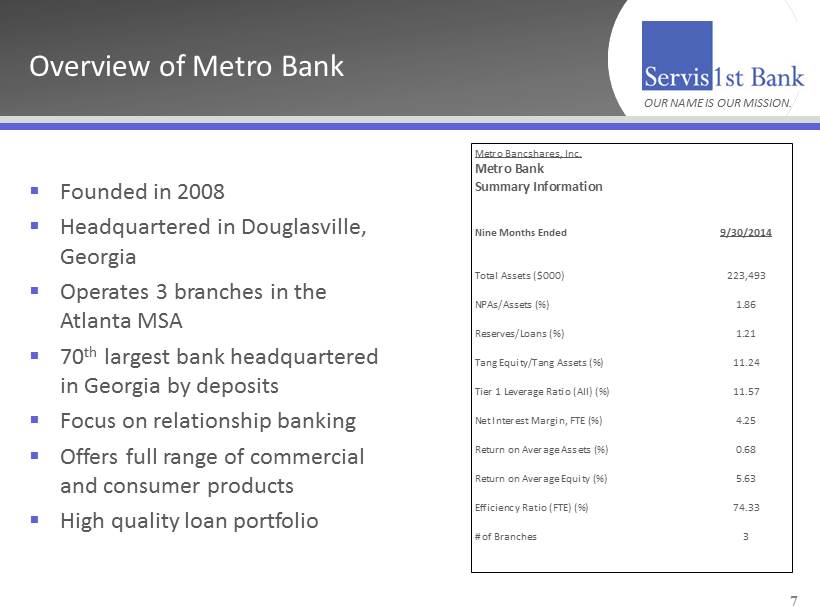 Credit Due Diligence ▪ Loan portfolio diligence conducted by Credit Risk Management ▪ Approximately 57% or $78 million of outstanding loan balances were reviewed ▪ The average outstanding balance of loans not reviewed was $139K ▪ 100% of OREO balances were reviewed OUR NAME IS OUR MISSION. 6