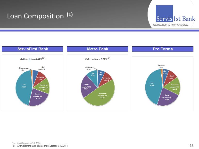 Loan Composition 12 OUR NAME IS OUR MISSION. ServisFirst Bank Acquired Metro Bank ServisFirst Bank ($000s) ($000s) ($000s) 9/30/2014 9/30/2014 Pro Forma 1,382,607$ 8,908$ 1,391,515$ 194,506$ 12,057$ 206,563$ Owner-occupied commercial 773,432$ 35,616$ 809,048$ 1-4 family mortgage 314,778$ 17,942$ 332,720$ Other mortgage 443,245$ 59,401$ 502,646$ Subtotal: Real estate - mortgage 1,531,455$ 112,960$ 1,644,415$ 51,204$ 6,721$ 57,925$ Total Loans 3,159,772$ 140,645$ 3,300,417$ Commercial, financial and agricultural Real estate - construction Real estate - mortgage: Consumer and other
