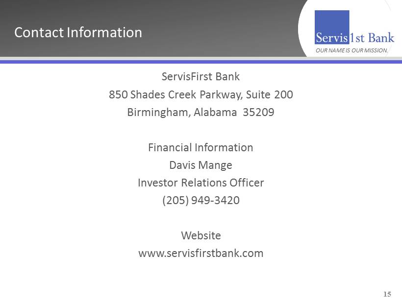 Geographical Footprint 14 OUR NAME IS OUR MISSION. ServisFirst Bank Branches (13) ServisFirst Bank LPO (Nashville ) Metro Bank Branches (3)