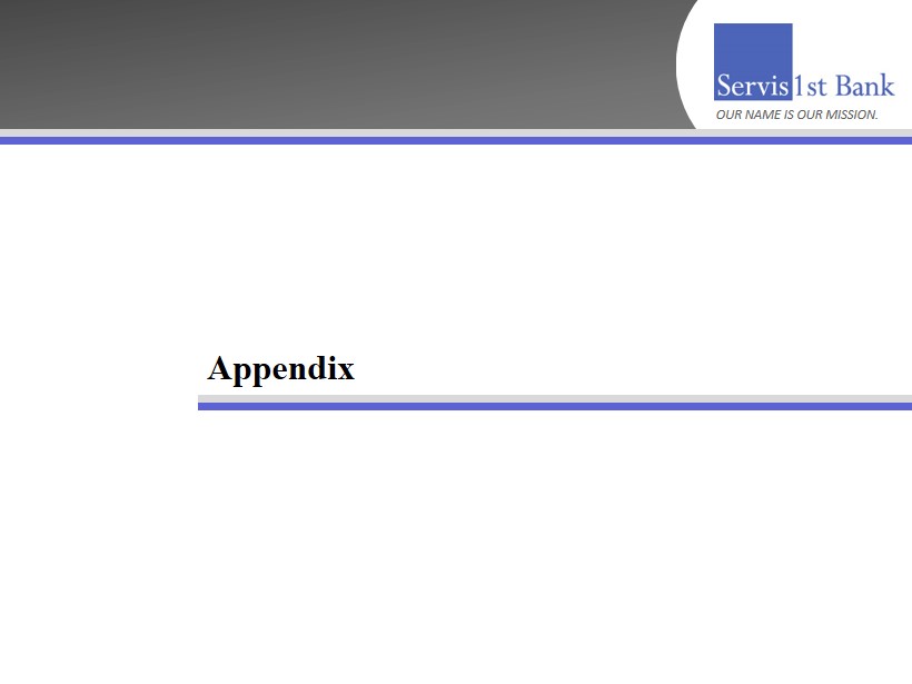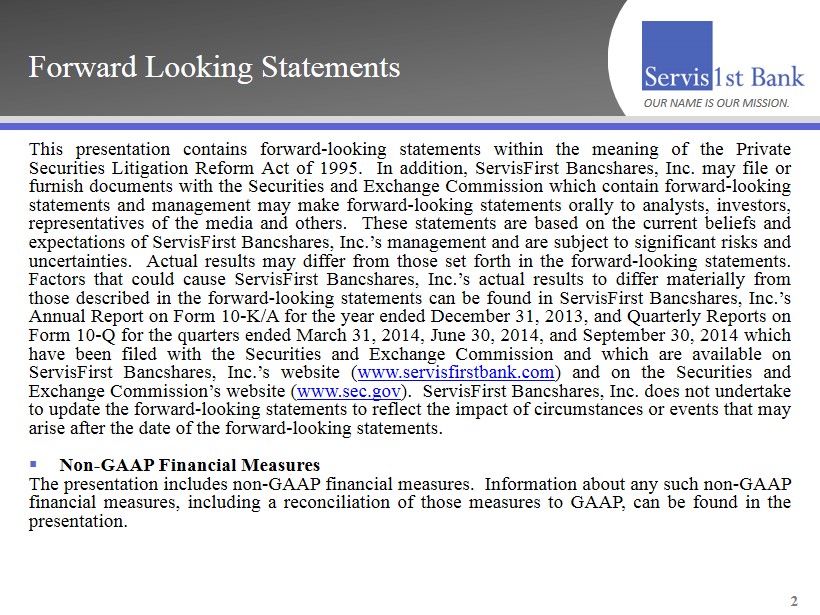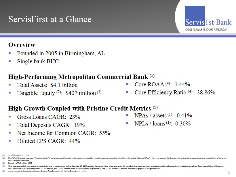 Forward Looking Statements This presentation contains forward - looking statements within the meaning of the Private Securities Litigation Reform Act of 1995 . In addition, ServisFirst Bancshares, Inc . may file or furnish documents with the Securities and Exchange Commission which contain forward - looking statements and management may make forward - looking statements orally to analysts, investors, representatives of the media and others . These statements are based on the current beliefs and expectations of ServisFirst Bancshares, Inc . ’s management and are subject to significant risks and uncertainties . Actual results may differ from those set forth in the forward - looking statements . Factors that could cause ServisFirst Bancshares, Inc . ’s actual results to differ materially from those described in the forward - looking statements can be found in ServisFirst Bancshares, Inc . ’s Annual Report on Form 10 - K/A for the year ended December 31 , 2013 , and Quarterly Reports on Form 10 - Q for the quarters ended March 31 , 2014 , June 30 , 2014 , and September 30 , 2014 which have been filed with the Securities and Exchange Commission and which are available on ServisFirst Bancshares, Inc . ’s website ( www . servisfirstbank . com ) and on the Securities and Exchange Commission’s website ( www . sec . gov ) . ServisFirst Bancshares, Inc . does not undertake to update the forward - looking statements to reflect the impact of circumstances or events that may arise after the date of the forward - looking statements . ▪ Non - GAAP Financial Measures The presentation includes non - GAAP financial measures . Information about any such non - GAAP financial measures, including a reconciliation of those measures to GAAP, can be found in the presentation . 2 OUR NAME IS OUR MISSION.