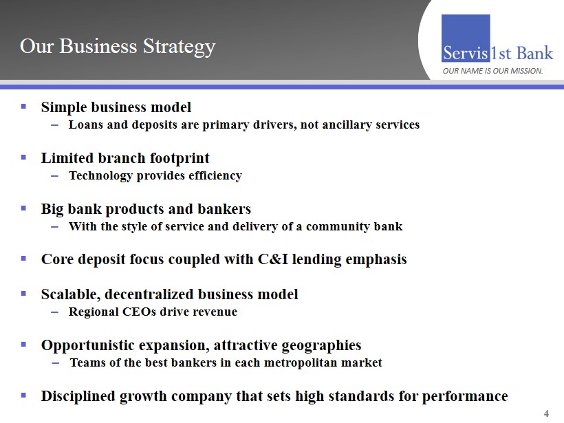 ServisFirst at a Glance Overview ▪ Founded in 2005 in Birmingham, AL ▪ Single bank BHC High - Performing Metropolitan Commercial Bank (1) ▪ Total Assets: $4.1 billion ▪ Tangible Equity (2) : $407 million (3 ) High Growth Coupled with Pristine Credit Metrics (5) ▪ Gross Loans CAGR: 23% ▪ Total Deposits CAGR: 19% ▪ Net Income for Common CAGR: 55% ▪ Diluted EPS CAGR: 44% 3 ▪ Core ROAA (4) : 1.44% ▪ Core Efficiency Ratio ( 4 ) : 38.86% (1) As of December 31, 2014 (2) Non - GAAP financial measures. “Tangible Equity” is not a measure of financial performance recognized by generally accepted accounting principles in the United States, or GAAP; However, bec aus e the Company has no intangible assets, there is no reconciliation of these non - GAAP financial measures . (3) Inclusive of $40 million SBLF (4) Core measures exclude non - routine expenses in the twelve month period ending December 31, 2014 resulting from a correction of our accounting for vested stock options previously granted to members of our advisory boards in our mark ets . For a reconciliation of these non - GAAP measures to the most comparable GAAP measure, see "GAAP Reconciliation and Management Explanation of Non - GAAP Financial Mea sures" included on page 34 of this presentation. (5) 5 - year compounded annual growth rate calculated from December 31, 2009 to December 31, 2014 ▪ NPAs / assets (1) : 0.41% ▪ NPLs / loans (1) : 0.30% OUR NAME IS OUR MISSION.