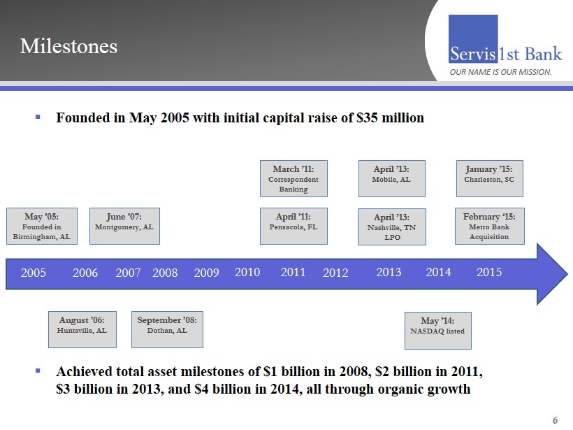 Opportunistic Expansion ▪ Identify great bankers in attractive markets – Focus on people as opposed to places – Target minimum of $300 million in deposits within 5 years – Best bankers in growing markets ▪ Market strategies – Regional CEOs execute simple business model – Back office support and risk management infrastructure – Non - legal board of directors comprised of key business people – Provide professional banking services to mid market commercial customers that have been neglected by or pushed down to branch personnel of national and other larger regional banks ▪ Opportunistic future expansion – Southern markets, metropolitan focus – Draw on expertise of industry contacts 5 OUR NAME IS OUR MISSION.