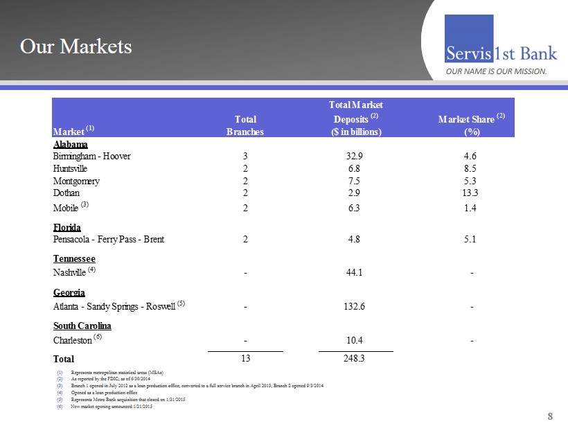 Milestones 6 ▪ Founded in May 2005 with initial capital raise of $35 million ▪ Achieved total asset milestones of $1 billion in 2008, $2 billion in 2011, $3 billion in 2013, and $4 billion in 2014, all through organic growth 2013 2014 May ’05: Founded in Birmingham, AL June ’07: Montgomery, AL March ’11: Correspondent Banking April ’13: Mobile, AL May ’14: NASDAQ listed August ’06: Huntsville, AL September ’08: Dothan, AL April ’11: Pensacola, FL April ’13: Nashville, TN LPO February ‘ 15: Metro Bank Acquisition OUR NAME IS OUR MISSION. January ’15: Charleston, SC 2015 2012 2013 2011 2010 2009 2008 2007 2006 2005