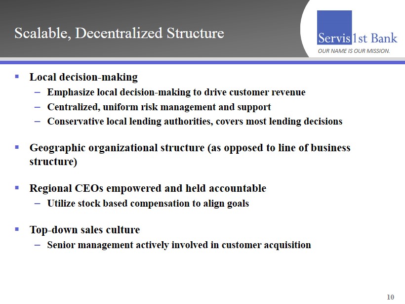 Our Business Model ▪ “Loan making and deposit taking ” – Traditional commercial banking services – No emphasis on non - traditional business lines ▪ Culture of cost control – “Branch light ”, with $261 million (1) average deposits per banking center – Leverage technology and centralized infrastructure – Headcount focused on production and risk management – Key products; including remote deposit capture, cash management, remote currency manager – Outsource selected functions ▪ C&I lending expertise – 44.5% of gross loans (1) – Target customers: privately held businesses $2 to $250 million in annual sales, professionals, affluent consumers 9 OUR NAME IS OUR MISSION. (1) As of December 31, 2014