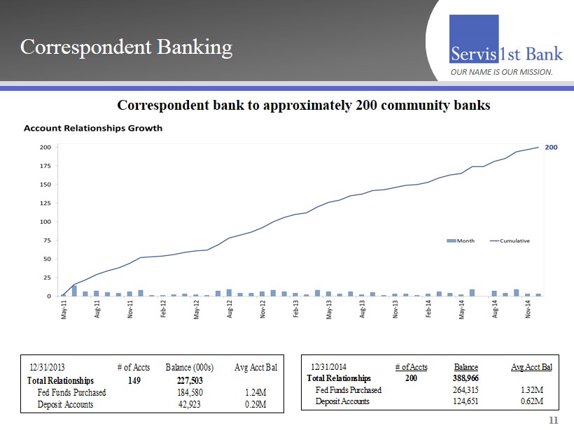 Scalable, Decentralized Structure ▪ Local decision - making – Emphasize local decision - making to drive customer revenue – Centralized, uniform risk management and support – Conservative local lending authorities, covers most lending decisions ▪ Geographic organizational structure (as opposed to line of business structure) ▪ Regional CEOs empowered and held accountable – Utilize stock based compensation to align goals ▪ Top - down sales culture – Senior management actively involved in customer acquisition 10 OUR NAME IS OUR MISSION.