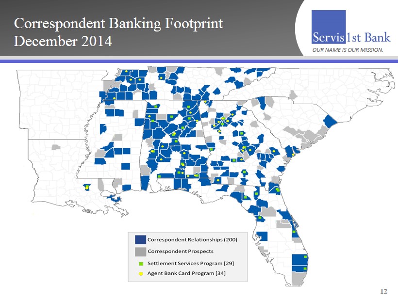 Correspondent Banking OUR NAME IS OUR MISSION. 11 Correspondent bank to approximately 200 community banks 12/31/2013 # of Accts Balance (000s) Avg Acct Bal Total Relationships 149 227,503 Fed Funds Purchased 184,580 1.24M Deposit Accounts 42,923 0.29M 12/31/2014 # of Accts Balance Avg Acct Bal Total Relationships 200 388,966 Fed Funds Purchased 264,315 1.32M Deposit Accounts 124,651 0.62M