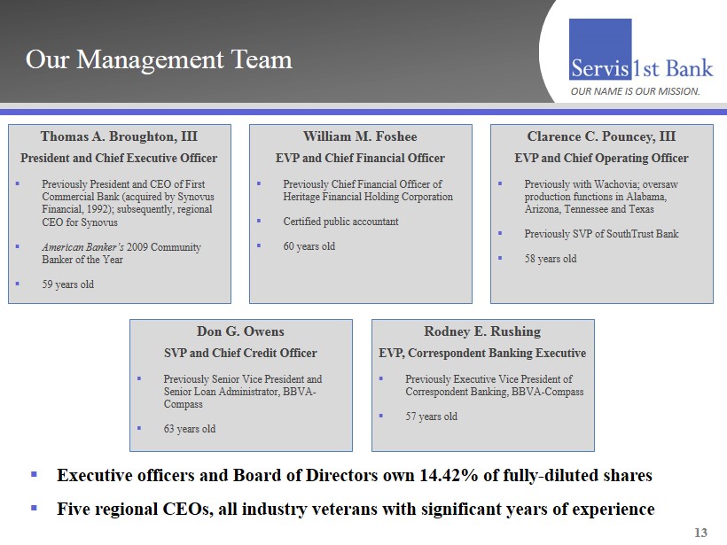 Our Management Team Thomas A. Broughton, III President and Chief Executive Officer ▪ Previously President and CEO of First Commercial Bank (acquired by Synovus Financial, 1992); subsequently, regional CEO for Synovus ▪ American Banker’s 2009 Community Banker of the Year ▪ 59 years old 13 OUR NAME IS OUR MISSION. William M. Foshee EVP and Chief Financial Officer ▪ Previously Chief Financial Officer of Heritage Financial Holding Corporation ▪ Certified public accountant ▪ 60 years old Clarence C. Pouncey , III EVP and Chief Operating Officer ▪ Previously with Wachovia; oversaw production functions in Alabama, Arizona, Tennessee and Texas ▪ Previously SVP of SouthTrust Bank ▪ 58 years old Don G. Owens SVP and Chief Credit Officer ▪ Previously Senior Vice President and Senior Loan Administrator, BBVA - Compass ▪ 63 years old Rodney E. Rushing EVP, Correspondent Banking Executive ▪ Previously Executive Vice President of Correspondent Banking, BBVA - Compass ▪ 57 years old ▪ Executive officers and Board of Directors own 14.42% of fully - diluted shares ▪ Five regional CEOs, all industry veterans with significant years of experience