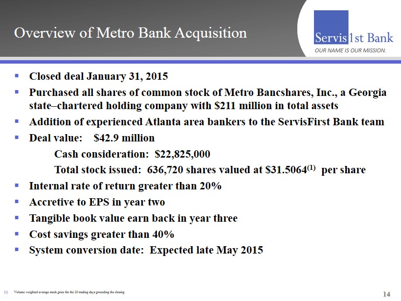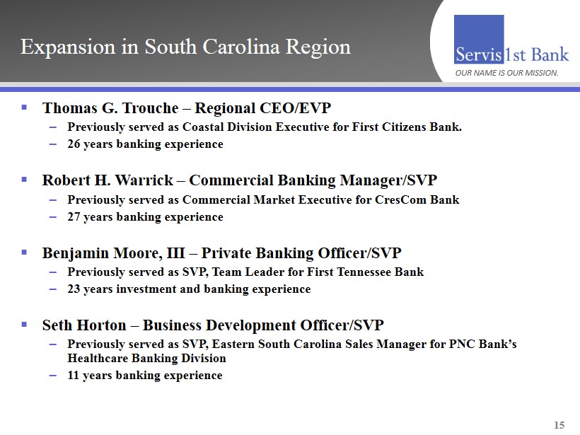 Overview of Metro Bank Acquisition ▪ Closed deal January 31, 2015 ▪ Purchased all shares of common stock of Metro Bancshares, Inc., a Georgia state – chartered holding company with $211 million in total assets ▪ Addition of experienced Atlanta area bankers to the ServisFirst Bank team ▪ Deal value: $42.9 million Cash consideration: $22,825,000 Total stock issued: 636,720 shares valued at $31.5064 (1) per share ▪ Internal rate of return greater than 20% ▪ Accretive to EPS in year two ▪ Tangible book value earn back in year three ▪ Cost savings greater than 40% ▪ System conversion date: Expected late May 2015 OUR NAME IS OUR MISSION. 14 (1) V olume weighted average stock price for the 20 trading days preceding the closing