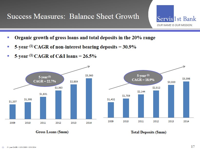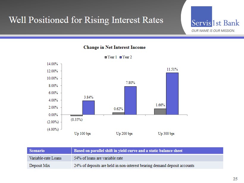 ▪ Our operating structure and business strategy enable efficient, profitable growth Success Measures: Efficiency 24 OUR NAME IS OUR MISSION. Core Efficiency Ratio (1) and Core Noninterest Expense / Average Assets (1) (1) (1) 59.93% 45.51% 45.54% 41.54% 38.78% 38.86 % 2.10% 1.85% 1.79% 1.64% 1.51% 1.47% 0.00% 1.00% 2.00% 3.00% 4.00% 5.00% 2009 2010 2011 2012 2013 2014 0.00% 10.00% 20.00% 30.00% 40.00% 50.00% 60.00% 70.00% Core Efficiency Ratio Core Non-interest Expense / Average Assets (1) Core measures exclude non - routine expenses in the twelve month period ending December 31, 2014 resulting from a correction of our accounting for vested stock options previously granted to members of our advisory boa rds in our markets. For a reconciliation of these non - GAAP measures to the most comparable GAAP measure, see "GAAP Reconciliation a nd Management Explanation of Non - GAAP Financial Measures" included on page 34 of this presentation.