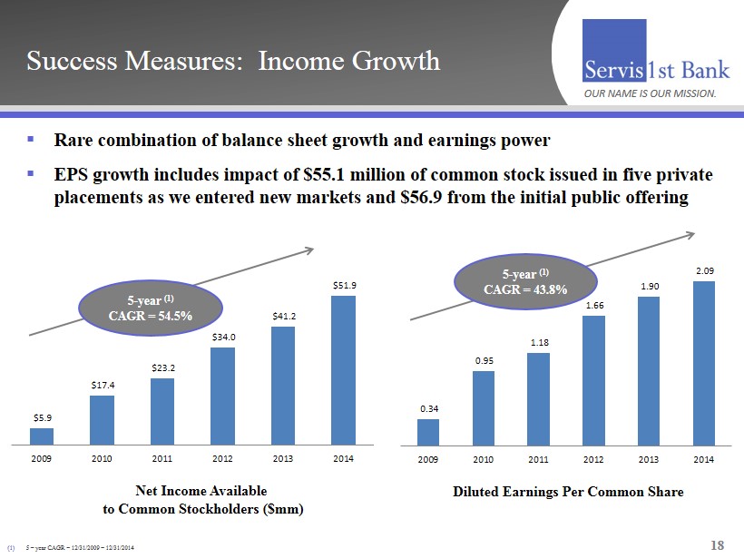 Success Measures: Balance Sheet Growth 17 OUR NAME IS OUR MISSION. 5 - year (1) CAGR = 22.7% 5 - year (1) CAGR = 18.9% Gross Loans ($mm) Total Deposits ($mm) ▪ Organic growth of gross loans and total deposits in the 20% range ▪ 5 - year (1) CAGR of non - interest bearing deposits = 30.9% ▪ 5 - year (1) CAGR of C&I loans = 26.5% $1,432 $1,759 $2,144 $2,512 $3,020 $3,398 2009 2010 2011 2012 2013 2014 $1,207 $1,395 $1,831 $2,363 $2,859 $3,360 2009 2010 2011 2012 2013 2014 (1) 5 – year CAGR = 12/31/2009 – 12/31/2014