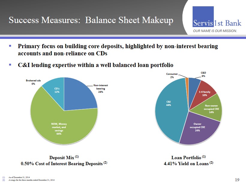 ▪ Rare combination of balance sheet growth and earnings power ▪ EPS growth includes impact of $55.1 million of common stock issued in five private placements as we entered new markets and $56.9 from the initial public offering Success Measures: Income Growth 18 OUR NAME IS OUR MISSION. 5 - year (1) CAGR = 54.5% 5 - year (1) CAGR = 43.8% Net Income Available to Common Stockholders ($mm) Diluted Earnings Per Common Share $5.9 $17.4 $23.2 $34.0 $41.2 $51.9 2009 2010 2011 2012 2013 2014 0.34 0.95 1.18 1.66 1.90 2.09 2009 2010 2011 2012 2013 2014 (1) 5 – year CAGR = 12/31/2009 – 12/31/2014