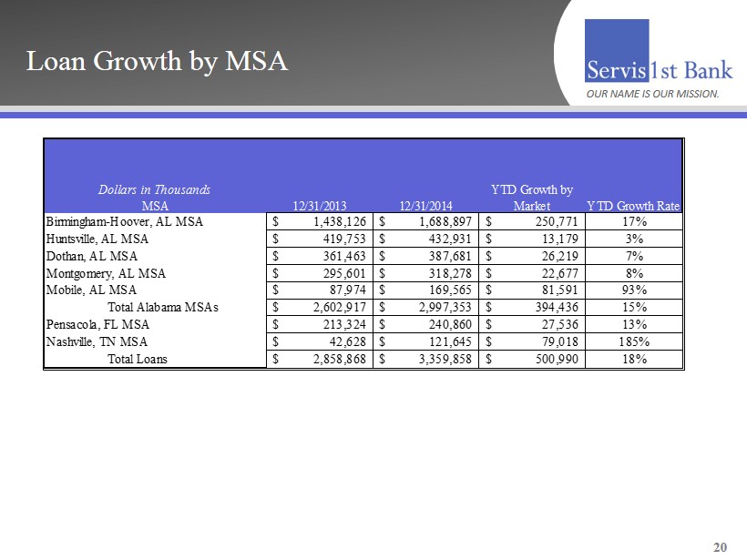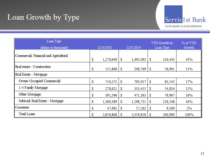 L oan Growth by MSA 20 OUR NAME IS OUR MISSION. 12/31/2013 12/31/2014 YTD Growth by Market YTD Growth Rate Birmingham-Hoover, AL MSA 1,438,126$ 1,688,897$ 250,771$ 17% Huntsville, AL MSA 419,753$ 432,931$ 13,179$ 3% Dothan, AL MSA 361,463$ 387,681$ 26,219$ 7% Montgomery, AL MSA 295,601$ 318,278$ 22,677$ 8% Mobile, AL MSA 87,974$ 169,565$ 81,591$ 93% Total Alabama MSAs 2,602,917$ 2,997,353$ 394,436$ 15% Pensacola, FL MSA 213,324$ 240,860$ 27,536$ 13% Nashville, TN MSA 42,628$ 121,645$ 79,018$ 185% Total Loans 2,858,868$ 3,359,858$ 500,990$ 18% Dollars in Thousands MSA