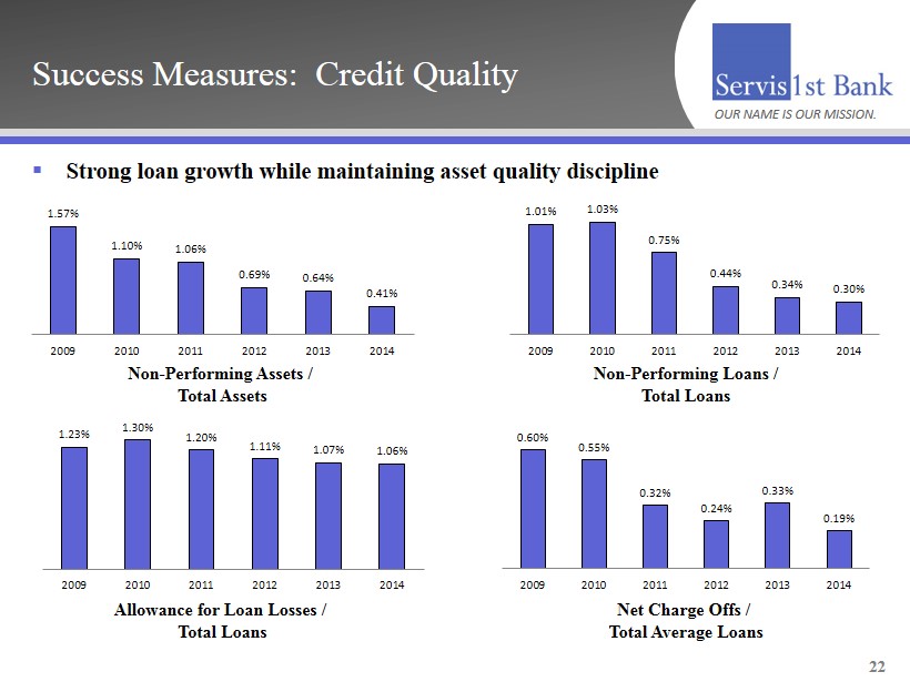 Loan Growth by Type OUR NAME IS OUR MISSION. 21 Loan Type (dollars in thousands) 12/31/2013 12/31/2014 1,278,649$ 1,495,092$ 216,443$ 43% 151,868$ 208,769$ 56,901$ 11% Owner-Occupied Commercial 710,372$ 793,917$ 83,545$ 17% 1-4 Family Mortgage 278,621$ 333,455$ 54,834$ 11% Other Mortgage 391,396$ 471,363$ 79,967$ 16% Subtotal: Real Estate - Mortgage 1,380,389$ 1,598,735$ 218,346$ 44% 47,962$ 57,262$ 9,300$ 2% Total Loans 2,858,868$ 3,359,858$ 500,990$ 100% YTD Growth by Loan Type % of YTD Growth Real Estate - Mortgage: Commercial, Financial and Agricultural Real estate - Construction Consumer