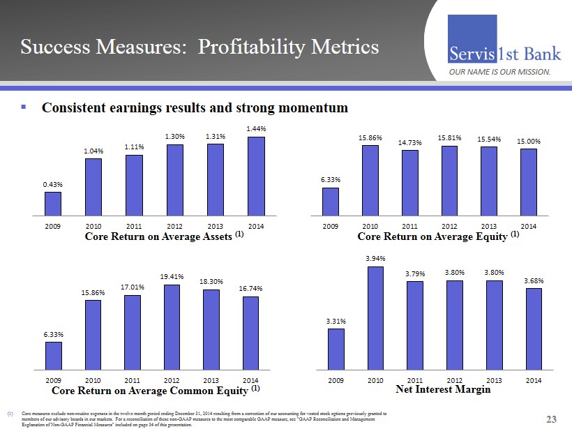 ▪ Strong loan growth while maintaining asset quality discipline Success Measures: Credit Quality 22 OUR NAME IS OUR MISSION. Allowance for Loan Losses / Total Loans Net Charge Offs / Total Average Loans Non - Performing Assets / Total Assets Non - Performing Loans / Total Loans 1.57% 1.10% 1.06% 0.69% 0.64% 0.41% 2009 2010 2011 2012 2013 2014 1.01% 1.03% 0.75% 0.44% 0.34% 0.30% 2009 2010 2011 2012 2013 2014 0.60% 0.55% 0.32% 0.24% 0.33% 0.19% 2009 2010 2011 2012 2013 2014 1.23% 1.30% 1.20% 1.11% 1.07% 1.06% 2009 2010 2011 2012 2013 2014