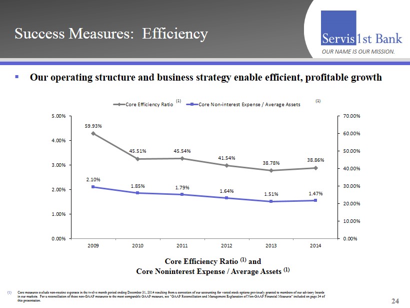 ▪ Consistent earnings results and strong momentum Success Measures: Profitability Metrics 23 OUR NAME IS OUR MISSION. Core Return on Average Assets (1) Core Return on Average Equity (1) Core Return on Average Common Equity (1) Net Interest Margin (1) Core measures exclude non - routine expenses in the twelve month period ending December 31, 2014 resulting from a correction of our accounting for vested stock options previously granted to members of our advisory boards in our markets. For a reconciliation of these non - GAAP measures to the most comparable GAAP meas ure, see "GAAP Reconciliation and Management Explanation of Non - GAAP Financial Measures" included on page 34 of this presentation. 0.43% 1.04% 1.11% 1.30% 1.31% 1.44% 2009 2010 2011 2012 2013 2014 6.33% 15.86% 14.73% 15.81% 15.54% 15.00% 2009 2010 2011 2012 2013 2014 6.33% 15.86% 17.01% 19.41% 18.30% 16.74% 2009 2010 2011 2012 2013 2014 3.31% 3.94% 3.79% 3.80% 3.80% 3.68% 2009 2010 2011 2012 2013 2014