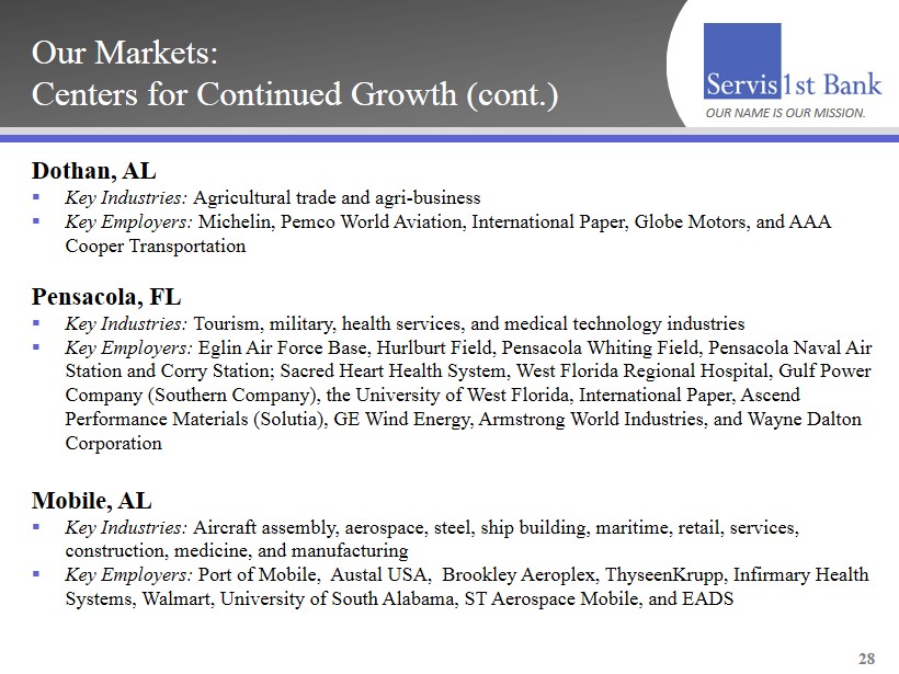 Our Markets: Centers for Continued Growth Birmingham, AL ▪ Key Industries: Metals manufacturing, finance , insurance, healthcare services and distribution ▪ Key Employers: Protective Life, HealthSouth Corporation, Vulcan Materials Company, AT&T, and The University of Alabama at Birmingham (UAB) ( Alabama’s largest employer) Huntsville, AL ▪ Key Industries: U.S. Government , commercial and university research ▪ Key Employers : U.S. Army/Redstone Arsenal, the Boeing Company, NASA/Marshall Space Flight Center, Intergraph Corporation, ADTRAN, Inc., Northrop Grumman, Cinram, SAIC, DirecTV, Lockheed Martin and Toyota Motor Manufacturing Montgomery, AL ▪ Key Industries : State of Alabama and U.S . Government, U.S. Air Force , automotive manufacturing ▪ Key Employers : Maxwell Gunter Air Force Base, Hyundai Motor Manufacturing 27 OUR NAME IS OUR MISSION.