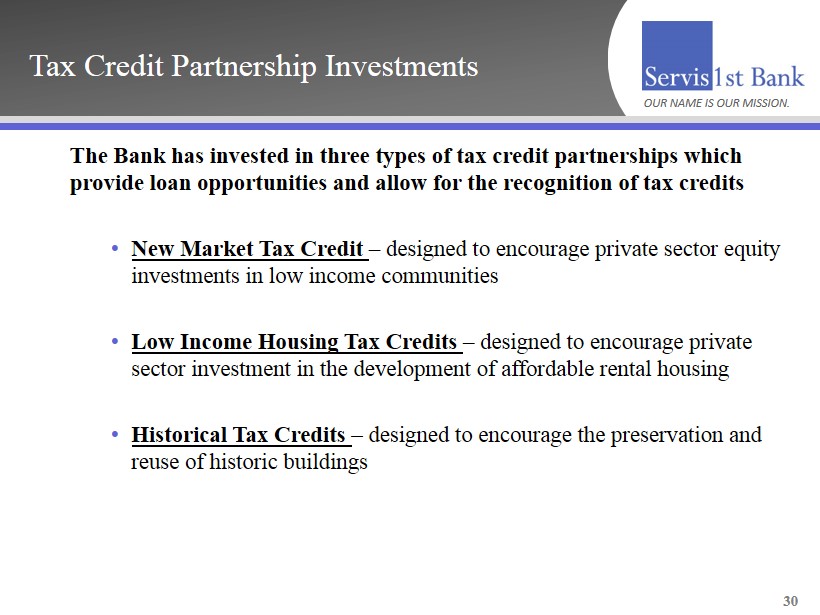Tax Credit Partnership Investments The Bank has invested in three types of tax credit partnerships which provide loan opportunities and allow for the recognition of tax credits • New Market Tax Credit – designed to encourage private sector equity investments in low income communities • Low Income Housing Tax Credits – designed to encourage private sector investment in the development of affordable rental housing • Historical Tax Credits – designed to encourage the preservation and reuse of historic buildings 30 OUR NAME IS OUR MISSION.
