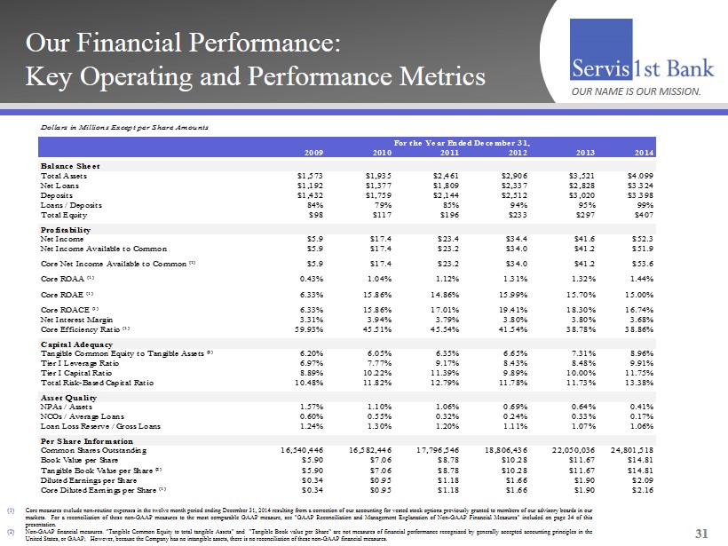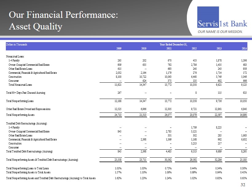 Our Financial Performance: Key Operating and Performance Metrics 31 OUR NAME IS OUR MISSION. Dollars in Millions Except per Share Amounts 2009 2010 2011 2012 2013 2014 Balance Sheet Total Assets $1,573 $1,935 $2,461 $2,906 $3,521 $4.099 Net Loans $1,192 $1,377 $1,809 $2,337 $2,828 $3.324 Deposits $1,432 $1,759 $2,144 $2,512 $3,020 $3.398 Loans / Deposits 84% 79% 85% 94% 95% 99% Total Equity $98 $117 $196 $233 $297 $407 Profitability Net Income $5.9 $17.4 $23.4 $34.4 $41.6 $52.3 Net Income Available to Common $5.9 $17.4 $23.2 $34.0 $41.2 $51.9 Core Net Income Available to Common (1) $5.9 $17.4 $23.2 $34.0 $41.2 $53.6 Core ROAA (1) 0.43% 1.04% 1.12% 1.31% 1.32% 1.44% Core ROAE (1) 6.33% 15.86% 14.86% 15.99% 15.70% 15.00% Core ROACE (1) 6.33% 15.86% 17.01% 19.41% 18.30% 16.74% Net Interest Margin 3.31% 3.94% 3.79% 3.80% 3.80% 3.68% Core Efficiency Ratio (1) 59.93% 45.51% 45.54% 41.54% 38.78% 38.86% Capital Adequacy Tangible Common Equity to Tangible Assets (2) 6.20% 6.05% 6.35% 6.65% 7.31% 8.96% Tier I Leverage Ratio 6.97% 7.77% 9.17% 8.43% 8.48% 9.91% Tier I Capital Ratio 8.89% 10.22% 11.39% 9.89% 10.00% 11.75% Total Risk-Based Capital Ratio 10.48% 11.82% 12.79% 11.78% 11.73% 13.38% Asset Quality NPAs / Assets 1.57% 1.10% 1.06% 0.69% 0.64% 0.41% NCOs / Average Loans 0.60% 0.55% 0.32% 0.24% 0.33% 0.17% Loan Loss Reserve / Gross Loans 1.24% 1.30% 1.20% 1.11% 1.07% 1.06% Per Share Information Common Shares Outstanding 16,540,446 16,582,446 17,796,546 18,806,436 22,050,036 24,801,518 Book Value per Share $5.90 $7.06 $8.78 $10.28 $11.67 $14.81 Tangible Book Value per Share (2) $5.90 $7.06 $8.78 $10.28 $11.67 $14.81 Diluted Earnings per Share $0.34 $0.95 $1.18 $1.66 $1.90 $2.09 Core Diluted Earnings per Share (1) $0.34 $0.95 $1.18 $1.66 $1.90 $2.16 For the Year Ended December 31, (1) Core measures exclude non - routine expenses in the twelve month period ending December 31 , 2014 resulting from a correction of our accounting for vested stock options previously granted to members of our advisory boards in our markets . For a reconciliation of these non - GAAP measures to the most comparable GAAP measure, see "GAAP Reconciliation and Management Explanation of Non - GAAP Financial Measures" included on page 34 of this presentation . (2) Non - GAAP financial measures . "Tangible Common E quity to total tangible Assets " and "Tangible Book value per Share " are not measures of financial performance recognized by generally accepted accounting principles in the United States, or GAAP ; However, because the Company has no intangible assets, there is no reconciliation of these non - GAAP financial measures .