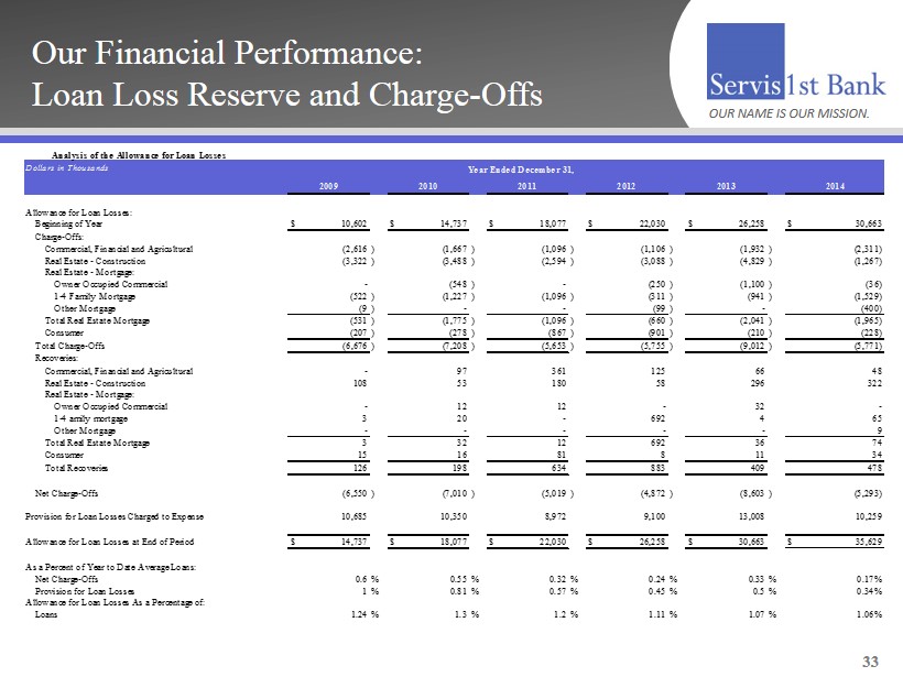 Our Financial Performance: Asset Quality 32 OUR NAME IS OUR MISSION. Dollars in Thousands 2009 2010 2011 2012 2013 2014 Nonaccrual Loans: 1-4 Family 265 202 670 453 1,878 1,596 Owner-Occupied Commercial Real Estate 909 635 792 2,786 1,435 683 Other Real Estate Loans 615 -- 693 240 243 959 Commercial, Financial & Agricultural Real Estate 2,032 2,164 1,179 276 1,714 172 Construction 8,100 10,722 10,063 6,460 3,749 5,049 Consumer -- 624 375 135 602 666 Total Nonaccrual Loans 11,921 14,347 13,772 10,350 9,621 9,125 Total 90+ Days Past Due and Accruing 267 -- -- 8 115 925 Total Nonperforming Loans 12,188 14,347 13,772 10,358 9,736 10,050 Other Real Estate Owned and Repossessions 12,525 6,966 12,305 9,721 12,861 6,840 Total Nonperforming Assets 24,713 21,313 26,077 20,079 22,597 16,890 Troubled Debt Restructurings (Accruing): 1-4 Family -- -- -- 1,709 8,225 -- Owner-Occupied Commercial Real Estate 845 -- 2,785 3,121 -- -- Other Real Estate Loans -- -- 331 302 285 1,663 Commercial, Financial & Agricultural Real Estate -- 2,398 1,369 1,168 962 6,632 Construction -- -- -- 3,213 217 -- Consumer -- -- -- -- -- -- Total Troubled Debt Restructurings (Accruing) 845 2,398 4,485 9,513 9,689 8,295 Total Nonperforming Assets & Troubled Debt Restructurings (Accruing) 25,558 23,711 30,562 29,592 32,286 25,185 Total Nonperforming Loans to Total Loans 1.01% 1.03% 0.75% 0.44% 0.34% 0.30% Total Nonperforming Assets to Total Assets 1.57% 1.10% 1.06% 0.69% 0.64% 0.41% Total Nonperforming Assets and Troubled Debt Restructurings (Accruing) to Total Assets 1.62% 1.23% 1.24% 1.02% 0.92% 0.61% Year Ended December 31,