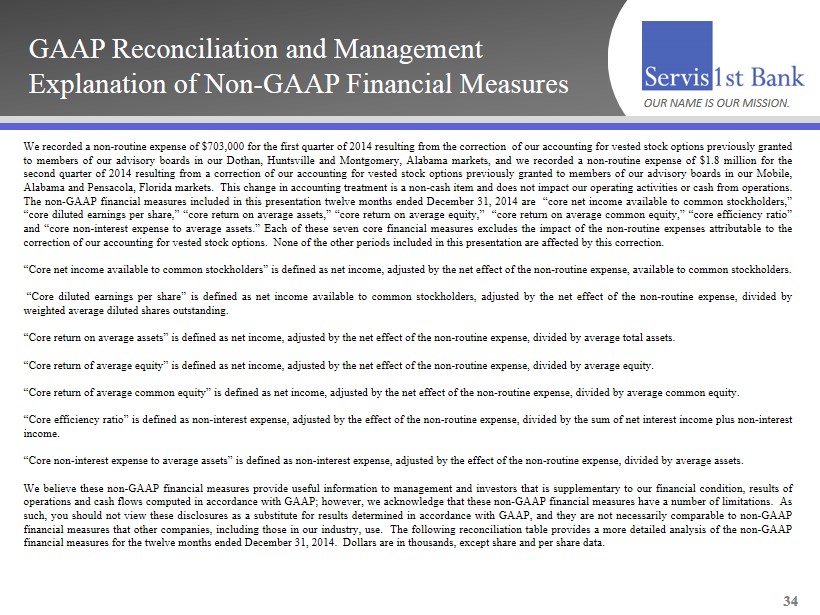 GAAP Reconciliation and Management Explanation of Non - GAAP Financial Measures 34 OUR NAME IS OUR MISSION. We recorded a non - routine expense of $ 703 , 000 for the first quarter of 2014 resulting from the correction of our accounting for vested stock options previously granted to members of our advisory boards in our Dothan, Huntsville and Montgomery, Alabama markets, and we recorded a non - routine expense of $ 1 . 8 million for the second quarter of 2014 resulting from a correction of our accounting for vested stock options previously granted to members of our advisory boards in our Mobile, Alabama and Pensacola, Florida markets . This change in accounting treatment is a non - cash item and does not impact our operating activities or cash from operations . The non - GAAP financial measures included in this presentation twelve months ended December 31 , 2014 are “core net income available to common stockholders,” “core diluted earnings per share,” “core return on average assets,” “core return on average equity,” “core return on average common equity,” “core efficiency ratio” and “core non - interest expense to average assets . ” Each of these seven core financial measures excludes the impact of the non - routine expenses attributable to the correction of our accounting for vested stock options . None of the other periods included in this presentation are affected by this correction . “Core net income available to common stockholders” is defined as net income, adjusted by the net effect of the non - routine expense, available to common stockholders . “Core diluted earnings per share” is defined as net income available to common stockholders, adjusted by the net effect of the non - routine expense, divided by weighted average diluted shares outstanding . “Core return on average assets” is defined as net income, adjusted by the net effect of the non - routine expense, divided by average total assets . “Core return of average equity” is defined as net income, adjusted by the net effect of the non - routine expense, divided by average equity . “Core return of average common equity” is defined as net income, adjusted by the net effect of the non - routine expense, divided by average common equity . “Core efficiency ratio” is defined as non - interest expense, adjusted by the effect of the non - routine expense, divided by the sum of net interest income plus non - interest income . “Core non - interest expense to average assets” is defined as non - interest expense, adjusted by the effect of the non - routine expense, divided by average assets . We believe these non - GAAP financial measures provide useful information to management and investors that is supplementary to our financial condition, results of operations and cash flows computed in accordance with GAAP ; however, we acknowledge that these non - GAAP financial measures have a number of limitations . As such, you should not view these disclosures as a substitute for results determined in accordance with GAAP, and they are not necessarily comparable to non - GAAP financial measures that other companies, including those in our industry, use . The following reconciliation table provides a more detailed analysis of the non - GAAP financial measures for the twelve months ended December 31 , 2014 . Dollars are in thousands, except share and per share data .