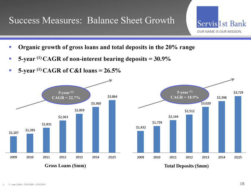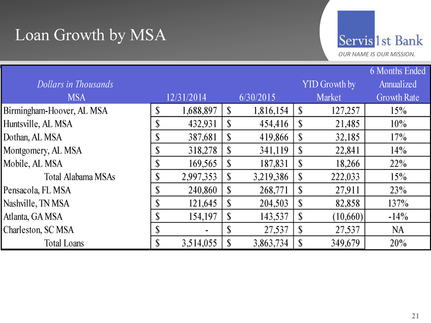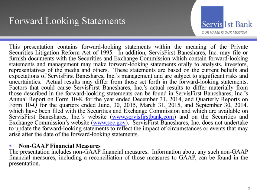 Forward Looking Statements This presentation contains forward - looking statements within the meaning of the Private Securities Litigation Reform Act of 1995 . In addition, ServisFirst Bancshares, Inc . may file or furnish documents with the Securities and Exchange Commission which contain forward - looking statements and management may make forward - looking statements orally to analysts, investors, representatives of the media and others . These statements are based on the current beliefs and expectations of ServisFirst Bancshares, Inc . ’s management and are subject to significant risks and uncertainties . Actual results may differ from those set forth in the forward - looking statements . Factors that could cause ServisFirst Bancshares, Inc . ’s actual results to differ materially from those described in the forward - looking statements can be found in ServisFirst Bancshares, Inc . ’s Annual Report on Form 10 - K for the year ended December 31 , 2014 , and Quarterly Reports on Form 10 - Q for the quarters ended June, 30 , 2015 , March 31 , 2015 , and September 30 , 2014 . which have been filed with the Securities and Exchange Commission and which are available on ServisFirst Bancshares, Inc . ’s website ( www . servisfirstbank . com ) and on the Securities and Exchange Commission’s website ( www . sec . gov ) . ServisFirst Bancshares, Inc . does not undertake to update the forward - looking statements to reflect the impact of circumstances or events that may arise after the date of the forward - looking statements . ▪ Non - GAAP Financial Measures The presentation includes non - GAAP financial measures . Information about any such non - GAAP financial measures, including a reconciliation of those measures to GAAP, can be found in the presentation . 2 OUR NAME IS OUR MISSION.