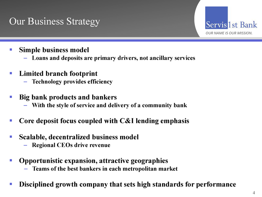 ServisFirst at a Glance Overview ▪ Founded in 2005 in Birmingham, AL ▪ Single bank BHC High - Performing Metropolitan Commercial Bank (1) ▪ Total Assets: $4.5 billion ▪ Stockholders’ Equity: $454 million (2) High Growth Coupled with Pristine Credit Metrics (4) ▪ Gross Loans CAGR: 23% ▪ Total Deposits CAGR: 19% ▪ Net Income for Common CAGR: 55% ▪ Diluted EPS CAGR: 44% 3 ▪ Core ROAA (3) : 1.37% ▪ Core Efficiency Ratio ( 3 ) : 41.00% 1) As of June 30, 2015 2) Inclusive of $40 million SBLF 3) Core measures in the first half of 2015 exclude merger expenses related to the acquisition of Metro Bancshares, Inc. and reserves for losses in unfunded loan commitments and letters of credit resulting from our change in methodology for estimating such losses , and in the first quarter of 2014 resulting from a correction of our accounting for vested stock options previously granted to members of our advisory boards in our mark ets . For a reconciliation of these non - GAAP measures to the most comparable GAAP measure, see "GAAP Reconciliation and Management Explanation of Non - GAAP Financial Measures" included on page 35 of this presentation. 4) 5 - year compounded annual growth rate calculated from December 31, 2009 to December 31, 2014 ▪ NPAs / assets (1) : 0.38% ▪ NPLs / loans (1) : 0.22% OUR NAME IS OUR MISSION.