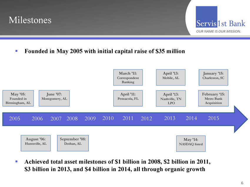 Opportunistic Expansion ▪ Identify great bankers in attractive markets – Focus on people as opposed to places – Target minimum of $300 million in assets within 5 years – Best bankers in growing markets • Production team (excluding mortgage origination) has grown by 33% in 2015. ▪ Market strategies – Regional CEOs execute simple business model – Back office support and risk management infrastructure – Non - legal board of directors comprised of key business people – Provide professional banking services to mid market commercial customers that have been neglected by or pushed down to branch personnel of national and other larger regional banks ▪ Opportunistic future expansion – Southern markets, metropolitan focus – Draw on expertise of industry contacts 5 OUR NAME IS OUR MISSION.