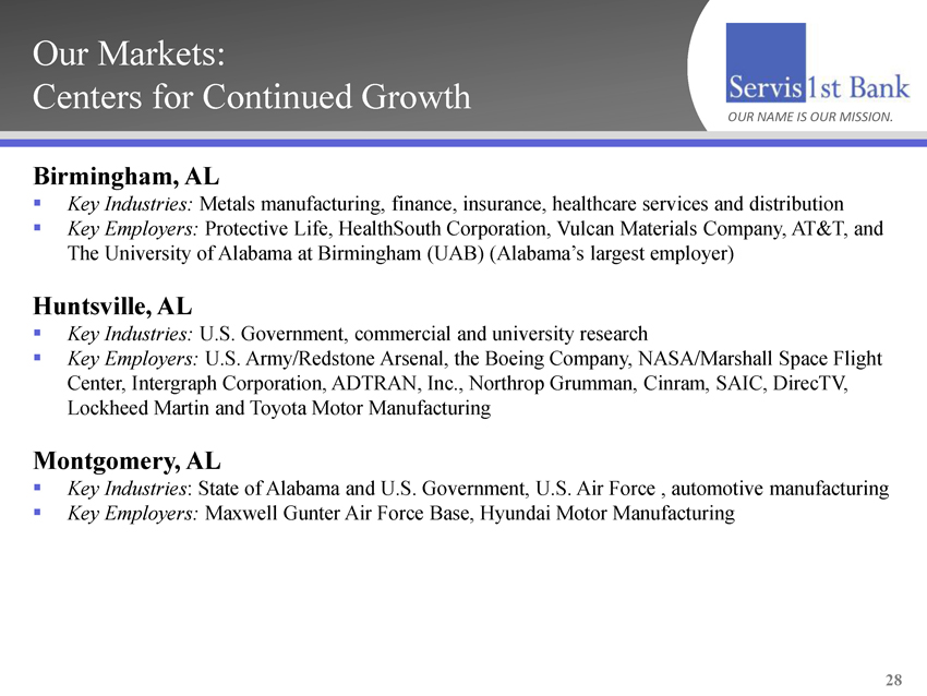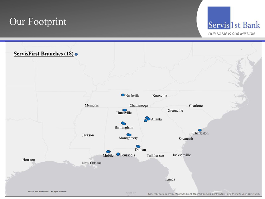 ServisFirst Branches (17) Our Footprint 7 Pensacola Mobile Dothan ServisFirst Branches (18) Nashville Huntsville Birmingham Atlanta Charleston Montgomery Jacksonville Tallahassee Savannah Greenville Knoxville Memphis Chattanooga Houston New Orleans Charlotte Jackson Tampa OUR NAME IS OUR MISSION