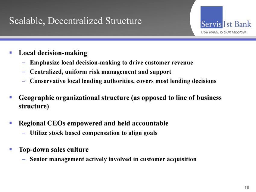 Our Business Model ▪ “Loan making and deposit taking ” – Traditional commercial banking services – No emphasis on non - traditional business lines ▪ Culture of cost control – “Branch light ”, with $291 million ( 1)(2) average deposits per banking center – Leverage technology and centralized infrastructure – Headcount focused on production and risk management – Key products; including remote deposit capture, cash management, remote currency manager – Outsource selected functions ▪ C&I lending expertise – 42% of gross loans (1) – Target customers: privately held businesses $2 to $250 million in annual sales, professionals, affluent consumers 9 OUR NAME IS OUR MISSION. 1) A s of June 30, 2015 2) Includes branches that have been opened or owned for a minimum of one year