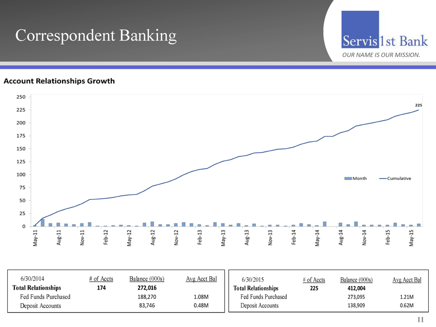 Scalable, Decentralized Structure ▪ Local decision - making – Emphasize local decision - making to drive customer revenue – Centralized, uniform risk management and support – Conservative local lending authorities, covers most lending decisions ▪ Geographic organizational structure (as opposed to line of business structure) ▪ Regional CEOs empowered and held accountable – Utilize stock based compensation to align goals ▪ Top - down sales culture – Senior management actively involved in customer acquisition 10 OUR NAME IS OUR MISSION.