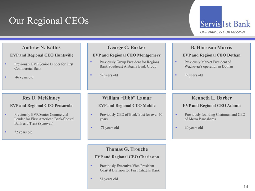 Our Management Team Thomas A. Broughton, III President and Chief Executive Officer ▪ Previously President and CEO of First Commercial Bank (acquired by Synovus Financial, 1992); subsequently, regional CEO for Synovus ▪ American Banker’s 2009 Community Banker of the Year ▪ 60 years old 13 OUR NAME IS OUR MISSION. William M. Foshee EVP and Chief Financial Officer ▪ Previously Chief Financial Officer of Heritage Financial Holding Corporation ▪ Certified public accountant ▪ 60 years old Clarence C. Pouncey , III EVP and Chief Operating Officer ▪ Previously with Wachovia; oversaw production functions in Alabama, Arizona, Tennessee and Texas ▪ Previously SVP of SouthTrust Bank ▪ 58 years old Don G. Owens SVP and Chief Credit Officer ▪ Previously Senior Vice President and Senior Loan Administrator, BBVA - Compass ▪ 63 years old Rodney E. Rushing EVP, Correspondent Banking Executive ▪ Previously Executive Vice President of Correspondent Banking, BBVA - Compass ▪ 57 years old ▪ Management team and Board of Directors own approximately 14% of fully - diluted shares