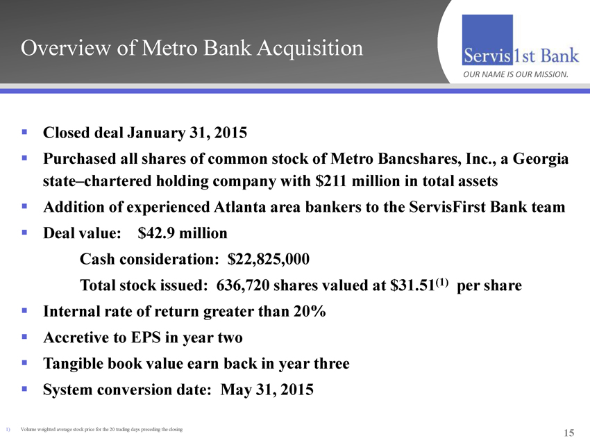 Overview of Metro Bank Acquisition ▪ Closed deal January 31, 2015 ▪ Purchased all shares of common stock of Metro Bancshares, Inc., a Georgia state – chartered holding company with $211 million in total assets ▪ Addition of experienced Atlanta area bankers to the ServisFirst Bank team ▪ Deal value: $42.9 million Cash consideration: $22,825,000 Total stock issued: 636,720 shares valued at $ 31.51 (1 ) per share ▪ Internal rate of return greater than 20% ▪ Accretive to EPS in year two ▪ Tangible book value earn back in year three ▪ System conversion date: May 31, 2015 OUR NAME IS OUR MISSION. 15 1) V olume weighted average stock price for the 20 trading days preceding the closing