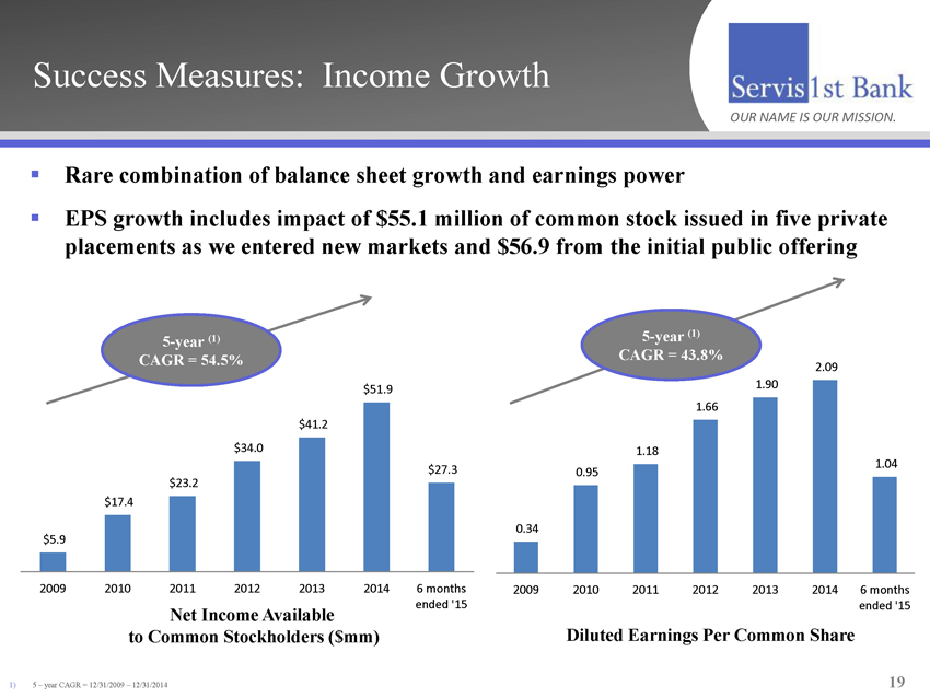 Success Measures: Balance Sheet Growth 18 OUR NAME IS OUR MISSION. 5 - year (1) CAGR = 22.7% 5 - year (1) CAGR = 18.9% Gross Loans ($mm) Total Deposits ($mm) ▪ Organic growth of gross loans and total deposits in the 20% range ▪ 5 - year (1) CAGR of non - interest bearing deposits = 30.9% ▪ 5 - year (1) CAGR of C&I loans = 26.5% $1,207 $1,395 $1,831 $2,363 $2,859 $3,360 $ 3,864 2009 2010 2011 2012 2013 2014 2Q15 1) 5 – year CAGR = 12/31/2009 – 12/31/2014 $1,432 $1,759 $2,144 $2,512 $3,020 $3,398 $ 3,729 2009 2010 2011 2012 2013 2014 2Q15