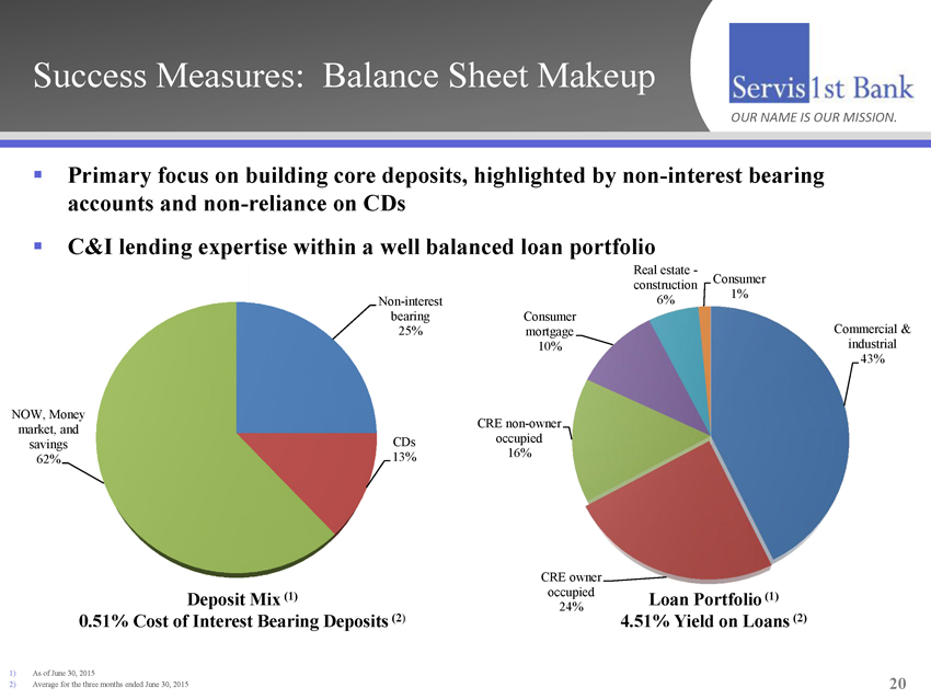 ▪ Rare combination of balance sheet growth and earnings power ▪ EPS growth includes impact of $55.1 million of common stock issued in five private placements as we entered new markets and $56.9 from the initial public offering Success Measures: Income Growth 19 OUR NAME IS OUR MISSION. 5 - year (1) CAGR = 54.5% 5 - year (1) CAGR = 43.8% Net Income Available to Common Stockholders ($mm) Diluted Earnings Per Common Share $5.9 $17.4 $23.2 $34.0 $41.2 $51.9 $27.3 2009 2010 2011 2012 2013 2014 6 months ended '15 0.34 0.95 1.18 1.66 1.90 2.09 1.04 2009 2010 2011 2012 2013 2014 6 months ended '15 1) 5 – year CAGR = 12/31/2009 – 12/31/2014