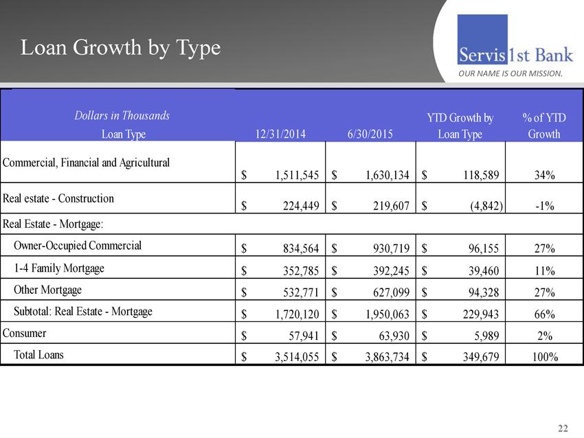 L oan Growth by MSA 21 OUR NAME IS OUR MISSION. 12/31/2014 6/30/2015 YTD Growth by Market 6 Months Ended Annualized Growth Rate Birmingham-Hoover, AL MSA 1,688,897$ 1,816,154$ 127,257$ 15% Huntsville, AL MSA 432,931$ 454,416$ 21,485$ 10% Dothan, AL MSA 387,681$ 419,866$ 32,185$ 17% Montgomery, AL MSA 318,278$ 341,119$ 22,841$ 14% Mobile, AL MSA 169,565$ 187,831$ 18,266$ 22% Total Alabama MSAs 2,997,353$ 3,219,386$ 222,033$ 15% Pensacola, FL MSA 240,860$ 268,771$ 27,911$ 23% Nashville, TN MSA 121,645$ 204,503$ 82,858$ 137% Atlanta, GA MSA 154,197$ 143,537$ (10,660)$ -14% Charleston, SC MSA -$ 27,537$ 27,537$ NA Total Loans 3,514,055$ 3,863,734$ 349,679$ 20% Dollars in Thousands MSA
