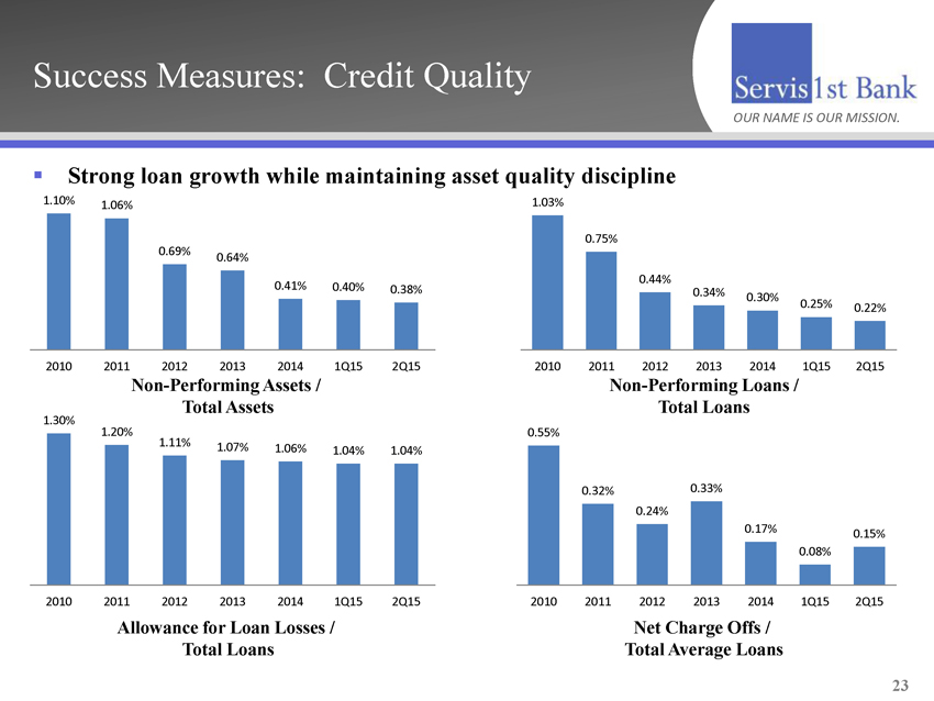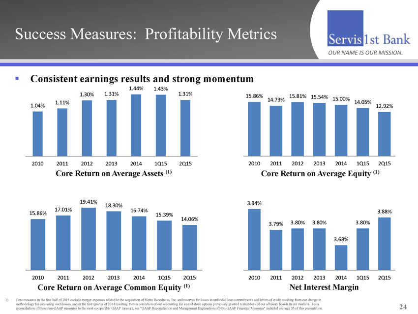 ▪ Strong loan growth while maintaining asset quality discipline Success Measures: Credit Quality 23 OUR NAME IS OUR MISSION. Allowance for Loan Losses / Total Loans Net Charge Offs / Total Average Loans Non - Performing Assets / Total Assets Non - Performing Loans / Total Loans 1.10% 1.06% 0.69% 0.64% 0.41% 0.40% 0.38% 2010 2011 2012 2013 2014 1Q15 2Q15 1.03% 0.75% 0.44% 0.34% 0.30% 0.25% 0.22% 2010 2011 2012 2013 2014 1Q15 2Q15 1.30% 1.20% 1.11% 1.07% 1.06% 1.04% 1.04% 2010 2011 2012 2013 2014 1Q15 2Q15 0.55% 0.32% 0.24% 0.33% 0.17% 0.08% 0.15% 2010 2011 2012 2013 2014 1Q15 2Q15
