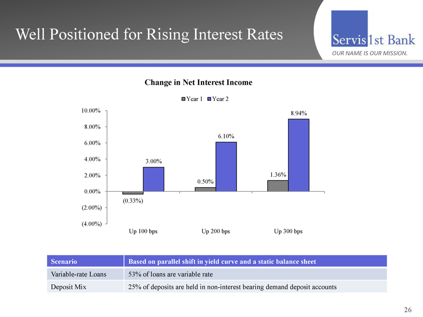 ▪ Our operating structure and business strategy enable efficient, profitable growth Success Measures: Efficiency 25 OUR NAME IS OUR MISSION. Core Efficiency Ratio (1) and Core Noninterest Expense / Average Assets (1) (1) (1) 1) Core measures in the first half of 2015 exclude merger expenses related to the acquisition of Metro Bancshares, Inc . and reserves for losses in unfunded loan commitments and letters of credit resulting from our change in methodology for estimating such losses, and in the first quarter of 2014 resulting from a correction of our accounting for vested stock options previously granted to members of our advisory boards in our markets . For a reconciliation of these non - GAAP measures to the most comparable GAAP measure, see "GAAP Reconciliation and Management Explanation of Non - GAAP Financial Measures" included on page 35 of this presentation . 45.51% 45.54% 41.54% 38.78% 38.86% 40.27% 41.66% 1.85% 1.79% 1.64% 1.51% 1.47% 1.56% 1.65% 0.00% 1.00% 2.00% 3.00% 4.00% 5.00% 2010 2011 2012 2013 2014 1Q15 2Q15 0.00% 10.00% 20.00% 30.00% 40.00% 50.00% 60.00% 70.00% Core Efficiency Ratio Core Non-interest Expense / Average Assets