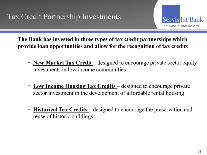 Tax Credit Partnership Investments The Bank has invested in three types of tax credit partnerships which provide loan opportunities and allow for the recognition of tax credits • New Market Tax Credit – designed to encourage private sector equity investments in low income communities • Low Income Housing Tax Credits – designed to encourage private sector investment in the development of affordable rental housing • Historical Tax Credits – designed to encourage the preservation and reuse of historic buildings 31 OUR NAME IS OUR MISSION.