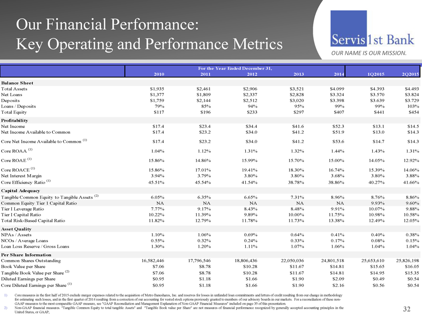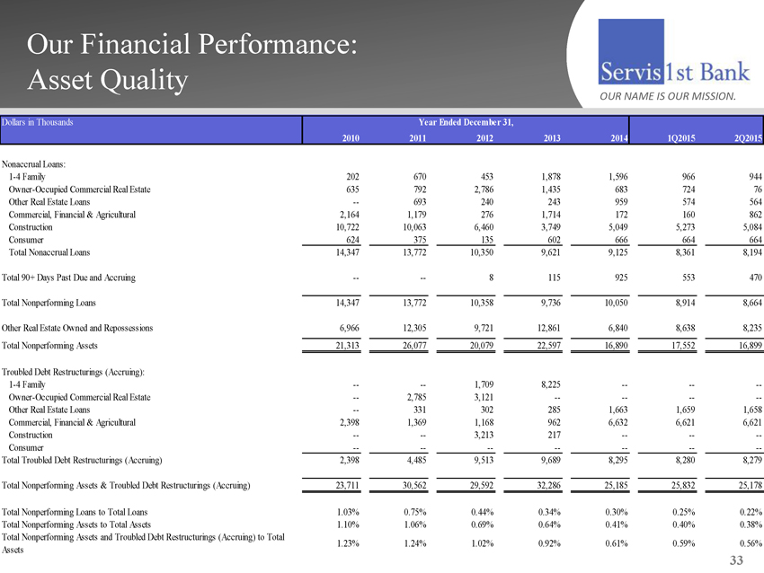 Our Financial Performance: Key Operating and Performance Metrics 32 OUR NAME IS OUR MISSION. 2010 2011 2012 2013 2014 1Q2015 2Q2015 Balance Sheet Total Assets $1,935 $2,461 $2,906 $3,521 $4.099 $4.393 $4.493 Net Loans $1,377 $1,809 $2,337 $2,828 $3.324 $3.570 $3.824 Deposits $1,759 $2,144 $2,512 $3,020 $3.398 $3.639 $3.729 Loans / Deposits 79% 85% 94% 95% 99% 99% 103% Total Equity $117 $196 $233 $297 $407 $441 $454 Profitability Net Income $17.4 $23.4 $34.4 $41.6 $52.3 $13.1 $14.5 Net Income Available to Common $17.4 $23.2 $34.0 $41.2 $51.9 $13.0 $14.3 Core Net Income Available to Common (1) $17.4 $23.2 $34.0 $41.2 $53.6 $14.7 $14.3 Core ROAA (1) 1.04% 1.12% 1.31% 1.32% 1.44% 1.43% 1.31% Core ROAE (1) 15.86% 14.86% 15.99% 15.70% 15.00% 14.05% 12.92% Core ROACE (1) 15.86% 17.01% 19.41% 18.30% 16.74% 15.39% 14.06% Net Interest Margin 3.94% 3.79% 3.80% 3.80% 3.68% 3.80% 3.88% Core Efficiency Ratio (1) 45.51% 45.54% 41.54% 38.78% 38.86% 40.27% 41.66% Capital Adequacy Tangible Common Equity to Tangible Assets (2) 6.05% 6.35% 6.65% 7.31% 8.96% 8.76% 8.86% Common Equity Tier 1 Capital Ratio NA NA NA NA NA 9.93% 9.60% Tier I Leverage Ratio 7.77% 9.17% 8.43% 8.48% 9.91% 10.07% 9.88% Tier I Capital Ratio 10.22% 11.39% 9.89% 10.00% 11.75% 10.98% 10.58% Total Risk-Based Capital Ratio 11.82% 12.79% 11.78% 11.73% 13.38% 12.49% 12.05% Asset Quality NPAs / Assets 1.10% 1.06% 0.69% 0.64% 0.41% 0.40% 0.38% NCOs / Average Loans 0.55% 0.32% 0.24% 0.33% 0.17% 0.08% 0.15% Loan Loss Reserve / Gross Loans 1.30% 1.20% 1.11% 1.07% 1.06% 1.04% 1.04% Per Share Information Common Shares Outstanding 16,582,446 17,796,546 18,806,436 22,050,036 24,801,518 25,653,610 25,826,198 Book Value per Share $7.06 $8.78 $10.28 $11.67 $14.81 $15.65 $16.05 Tangible Book Value per Share (2) $7.06 $8.78 $10.28 $11.67 $14.81 $14.95 $15.35 Diluted Earnings per Share $0.95 $1.18 $1.66 $1.90 $2.09 $0.49 $0.54 Core Diluted Earnings per Share (1) $0.95 $1.18 $1.66 $1.90 $2.16 $0.56 $0.54 For the Year Ended December 31, 1) Core measures in the first half of 2015 exclude merger expenses related to the acquisition of Metro Bancshares, Inc. and reserves for losses in unfunded loan co mmitments and letters of credit resulting from our change in methodology for estimating such losses, and in the first quarter of 2014 resulting from a correction of our accounting for vested stock o pti ons previously granted to members of our advisory boards in our markets. For a reconciliation of these non - GAAP measures to the most comparable GAAP measure, see "GAAP Reconciliation and Management Explanation of Non - GAAP Financial Mea sures" included on page 35 of this presentation. 2) Non - GAAP financial measures . "Tangible Common E quity to total tangible Assets " and "Tangible Book value per Share " are not measures of financial performance recognized by generally accepted accounting principles in the United States, or GAAP ;
