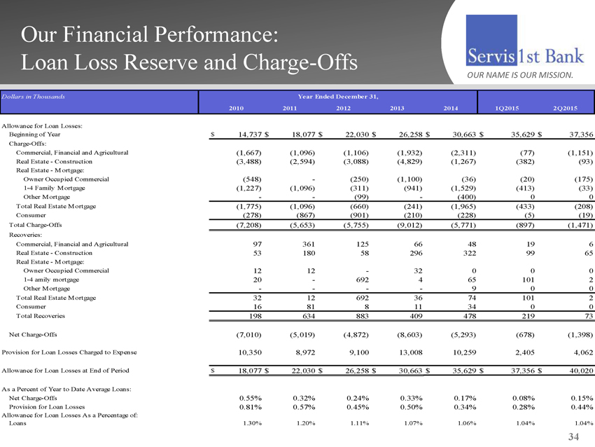 Our Financial Performance: Asset Quality 33 OUR NAME IS OUR MISSION. Dollars in Thousands 2010 2011 2012 2013 2014 1Q2015 2Q2015 Nonaccrual Loans: 1-4 Family 202 670 453 1,878 1,596 966 944 Owner-Occupied Commercial Real Estate 635 792 2,786 1,435 683 724 76 Other Real Estate Loans -- 693 240 243 959 574 564 Commercial, Financial & Agricultural 2,164 1,179 276 1,714 172 160 862 Construction 10,722 10,063 6,460 3,749 5,049 5,273 5,084 Consumer 624 375 135 602 666 664 664 Total Nonaccrual Loans 14,347 13,772 10,350 9,621 9,125 8,361 8,194 Total 90+ Days Past Due and Accruing -- -- 8 115 925 553 470 Total Nonperforming Loans 14,347 13,772 10,358 9,736 10,050 8,914 8,664 Other Real Estate Owned and Repossessions 6,966 12,305 9,721 12,861 6,840 8,638 8,235 Total Nonperforming Assets 21,313 26,077 20,079 22,597 16,890 17,552 16,899 Troubled Debt Restructurings (Accruing): 1-4 Family -- -- 1,709 8,225 -- -- -- Owner-Occupied Commercial Real Estate -- 2,785 3,121 -- -- -- -- Other Real Estate Loans -- 331 302 285 1,663 1,659 1,658 Commercial, Financial & Agricultural 2,398 1,369 1,168 962 6,632 6,621 6,621 Construction -- -- 3,213 217 -- -- -- Consumer -- -- -- -- -- -- -- Total Troubled Debt Restructurings (Accruing) 2,398 4,485 9,513 9,689 8,295 8,280 8,279 Total Nonperforming Assets & Troubled Debt Restructurings (Accruing) 23,711 30,562 29,592 32,286 25,185 25,832 25,178 Total Nonperforming Loans to Total Loans 1.03% 0.75% 0.44% 0.34% 0.30% 0.25% 0.22% Total Nonperforming Assets to Total Assets 1.10% 1.06% 0.69% 0.64% 0.41% 0.40% 0.38% Total Nonperforming Assets and Troubled Debt Restructurings (Accruing) to Total Assets 1.23% 1.24% 1.02% 0.92% 0.61% 0.59% 0.56% Year Ended December 31,