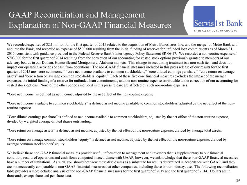 GAAP Reconciliation and Management Explanation of Non - GAAP Financial Measures 35 OUR NAME IS OUR MISSION. W e recorded expenses of $2.1 million for the first quarter of 2015 related to the acquisition of Metro Bancshares, Inc. and the mer ger of Metro Bank with and into the Bank, and recorded an expense of $500,000 resulting from the initial funding of reserves for unfunded loan commi tme nts as of March 31, 2015, consistent with guidance provided in the Federal Reserve Bank’s Inter - agency Policy Statement SR 06 - 17. We recorded a non - routine expense of $703,000 for the first quarter of 2014 resulting from the correction of our accounting for vested stock options previously gr ant ed to members of our advisory boards in our Dothan, Huntsville and Montgomery, Alabama markets. This change in accounting treatment is a non - cash it em and does not impact our operating activities or cash from operations. The non - GAAP financial measures included in this press release of our results for the first quarter of 2015 are “core net income,” “core net income available to common stockholders,” “core diluted earnings per share,” “c ore return on average assets” and “core return on average common stockholders’ equity.” Each of these five core financial measures excludes the im pac t of the merger expenses, the initial funding of a reserve for unfunded loan commitments, and the non - routine expense attributable to the correc tion of our accounting for vested stock options. None of the other periods included in this press release are affected by such non - routine expenses. “Core net income” is defined as net income, adjusted by the net effect of the non - routine expense. “Core net income available to common stockholders” is defined as net income available to common stockholders, adjusted by the ne t effect of the non - routine expense. “Core diluted earnings per share” is defined as net income available to common stockholders, adjusted by the net effect of th e n on - routine expense, divided by weighted average diluted shares outstanding. “Core return on average assets” is defined as net income, adjusted by the net effect of the non - routine expense, divided by aver age total assets. “Core return on average common stockholders’ equity” is defined as net income, adjusted by the net effect of the non - routine exp ense, divided by average common stockholders’ equity. We believe these non - GAAP financial measures provide useful information to management and investors that is supplementary to our fi nancial condition, results of operations and cash flows computed in accordance with GAAP; however, we acknowledge that these non - GAAP fi nancial measures have a number of limitations. As such, you should not view these disclosures as a substitute for results determined in accor dan ce with GAAP, and they are not necessarily comparable to non - GAAP financial measures that other companies, including those in our industry, use. The f ollowing reconciliation table provides a more detailed analysis of the non - GAAP financial measures for the first quarter of 2015 and the first quarter o f 2014. Dollars are in thousands, except share and per share data.