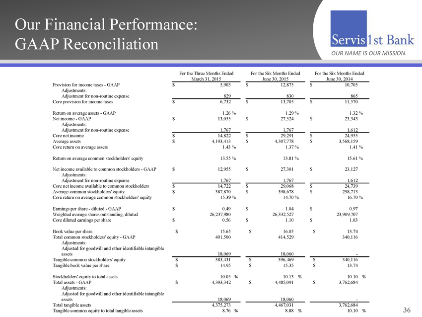 Our Financial Performance: GAAP Reconciliation OUR NAME IS OUR MISSION. 36 For the Three Months Ended March 31, 2015 For the Six Months Ended June 30, 2015 For the Six Months Ended June 30, 2014 Provision for income taxes - GAAP $ 5,903 $ 12,875 $ 10,705 Adjustments: Adjustment for non - routine expense 829 830 865 Core provision for income taxes $ 6,732 $ 13,705 $ 11,570 Return on average assets - GAAP 1.26 % 1.29 % 1.32 % Net income - GAAP $ 13,055 $ 27,524 $ 23,343 Adjustments: Adjustment for non - routine expense 1,767 1,767 1,612 Core net income $ 14,822 $ 29,291 $ 24,955 Average assets $ 4,193,413 $ 4,307,778 $ 3,568,159 Core return on average assets 1.43 % 1.37 % 1.41 % Return on average common stockholders' equity 13.55 % 13.81 % 15.61 % Net income available to common stockholders - GAAP $ 12,955 $ 27,301 $ 23,127 Adjustments: Adjustment for non - routine expense 1,767 1,767 1,612 Core net income available to common stockholders $ 14,722 $ 29,068 $ 24,739 Average common stockholders' equity $ 387,870 $ 398,678 $ 298,713 Core return on average common stockholders' equity 15.39 % 14.70 % 16.70 % Earnings per share - diluted - GAAP $ 0.49 $ 1.04 $ 0.97 Weighted average shares outstanding, diluted 26,237,980 26,332,527 23,909,707 Core diluted earnings per share $ 0.56 $ 1.10 $ 1.03 Book value per share $ 15.65 $ 16.05 $ 13.74 Total common stockholders' equity - GAAP 401,500 414,529 340,116 Adjustments: Adjusted for goodwill and other identifiable intangible assets 18,069 18,060 - Tangible common stockholders' equity $ 383,431 $ 396,469 $ 340,116 Tangible book value per share $ 14.95 $ 15.35 $ 13.74 Stockholders' equity to total assets 10.05 % 10.13 % 10.10 % Total assets - GAAP $ 4,393,342 $ 4,485,091 $ 3,762,684 Adjustments: Adjusted for goodwill and other identifiable intangible assets 18,069 18,060 - Total tangible assets 4,375,273 4,467,031 3,762,684 Tangible common equity to total tangible assets 8.76 % 8.88 % 10.10 %