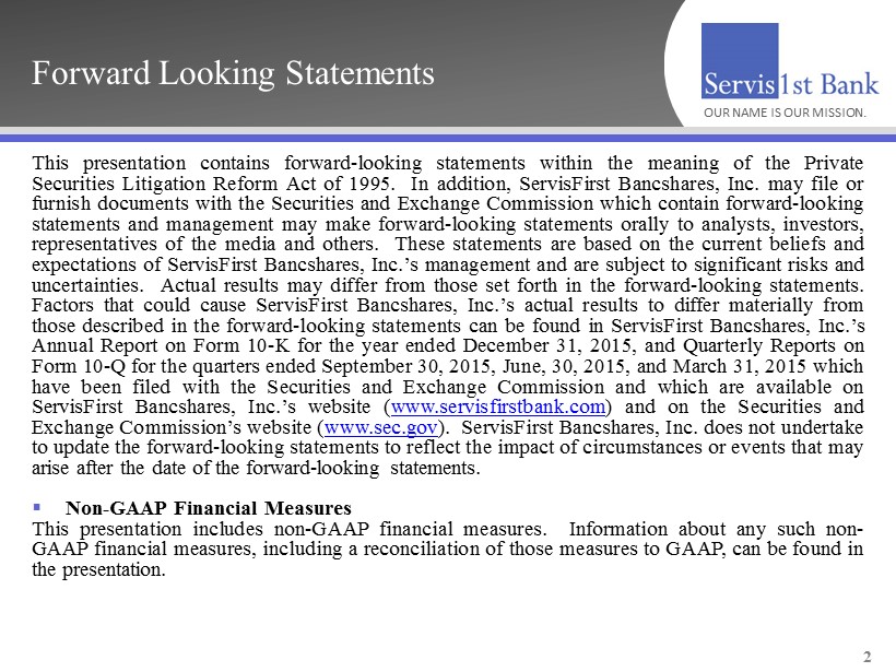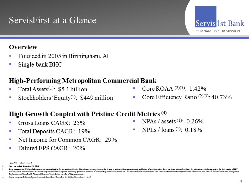 Forward Looking Statements This presentation contains forward - looking statements within the meaning of the Private Securities Litigation Reform Act of 1995 . In addition, ServisFirst Bancshares, Inc . may file or furnish documents with the Securities and Exchange Commission which contain forward - looking statements and management may make forward - looking statements orally to analysts, investors, representatives of the media and others . These statements are based on the current beliefs and expectations of ServisFirst Bancshares, Inc . ’s management and are subject to significant risks and uncertainties . Actual results may differ from those set forth in the forward - looking statements . Factors that could cause ServisFirst Bancshares, Inc . ’s actual results to differ materially from those described in the forward - looking statements can be found in ServisFirst Bancshares, Inc . ’s Annual Report on Form 10 - K for the year ended December 31 , 2015 , and Quarterly Reports on Form 10 - Q for the quarters ended September 30 , 2015 , June , 30 , 2015 , and March 31 , 2015 which have been filed with the Securities and Exchange Commission and which are available on ServisFirst Bancshares, Inc . ’s website ( www . servisfirstbank . com ) and on the Securities and Exchange Commission’s website ( www . sec . gov ) . ServisFirst Bancshares, Inc . does not undertake to update the forward - looking statements to reflect the impact of circumstances or events that may arise after the date of the forward - looking statements . ▪ Non - GAAP Financial Measures This presentation includes non - GAAP financial measures . Information about any such non - GAAP financial measures, including a reconciliation of those measures to GAAP, can be found in the presentation . 2 OUR NAME IS OUR MISSION.