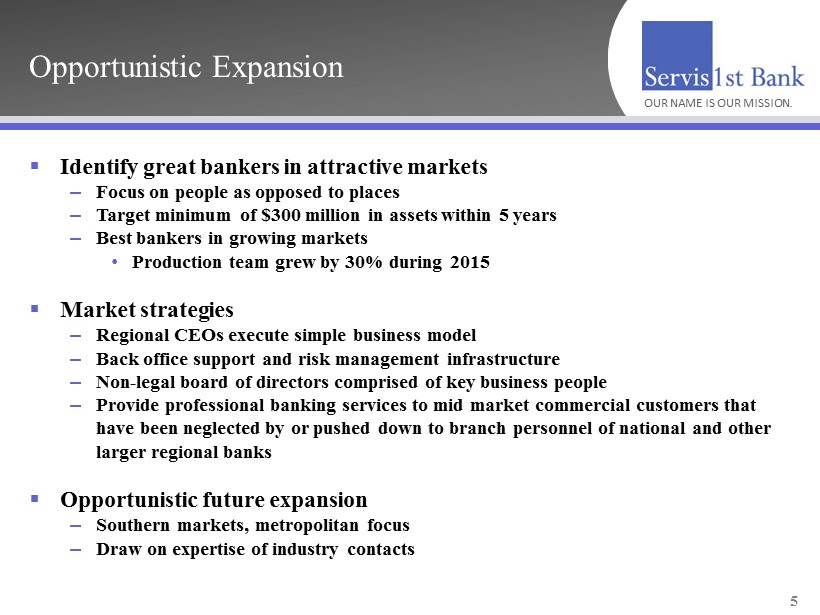 ServisFirst at a Glance Overview ▪ Founded in 2005 in Birmingham, AL ▪ Single bank BHC High - Performing Metropolitan Commercial Bank ▪ Total Assets (1) : $5.1 billion ▪ Stockholders’ Equity (1) : $449 million High Growth Coupled with Pristine Credit Metrics (4) ▪ Gross Loans CAGR: 25% ▪ Total Deposits CAGR: 19% ▪ Net Income for Common CAGR: 29% ▪ Diluted EPS CAGR: 20% 3 ▪ Core ROAA (2)(3) : 1.42% ▪ Core Efficiency Ratio (2)(3) : 40.73 % 1) As of December 31, 2015 2) For year ended December 31, 2015 3) Core measures in 2015 exclude merger expenses related to the acquisition of Metro Bancshares, Inc. and reserves for losses in un funded loan commitments and letters of credit resulting from our change in methodology for estimating such losses, and in the fi rst quarter of 2014 resulting from a correction of our accounting for vested stock options previously granted to members of our advisory boards i n o ur markets. For a reconciliation of these non - GAAP measures to the most comparable GAAP measure, see "GAAP Reconciliation and M anagement Explanation of Non - GAAP Financial Measures" included on page 34 of this presentation. 4 ) 5 - year compounded annual growth rate calculated from December 31, 2010 to December 31, 2015 ▪ NPAs / assets (1) : 0.26% ▪ NPLs / loans (1) : 0.18% OUR NAME IS OUR MISSION.