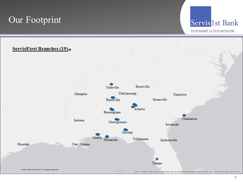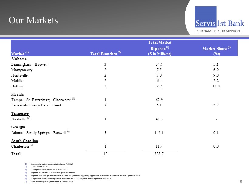 ServisFirst Branches (17) Our Footprint 7 Pensacola Mobile Dothan ServisFirst Branches (19) Nashville Huntsville Birmingham Atlanta Charleston Montgomery Jacksonville Tallahassee Savannah Greenville Knoxville Memphis Chattanooga Houston New Orleans Charlotte Jackson Tampa OUR NAME IS OUR MISSION.