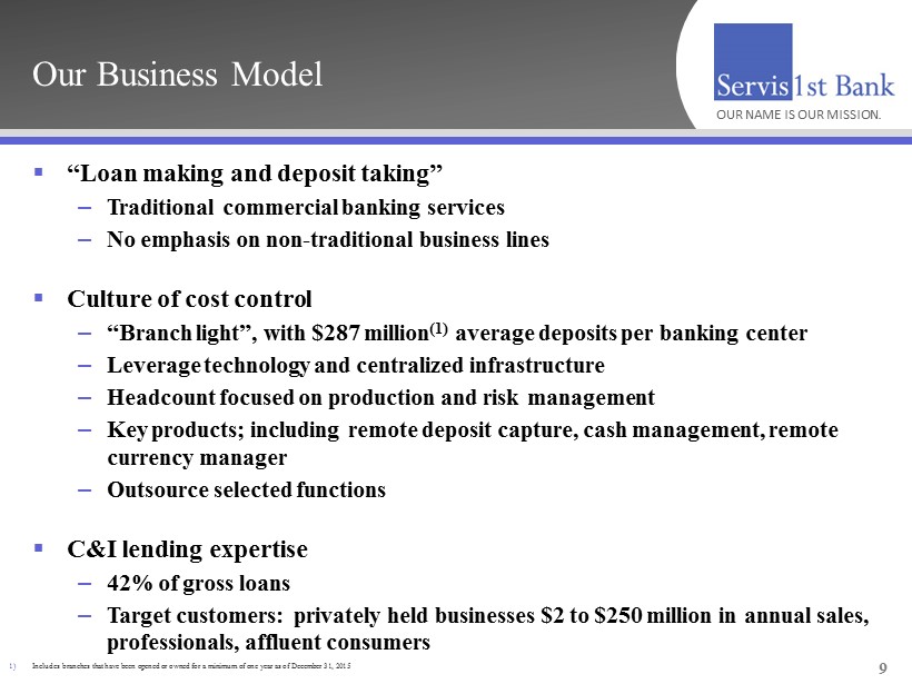 Our Markets 8 OUR NAME IS OUR MISSION. 1) Represents metropolitan statistical areas (MSAs ) 2) As of March 2016 3) As reported by the FDIC as of 6/30/2015 4) Opened in January 2016 as a loan production office 5) Opened as a loan production office in June 2013; received regulatory approval to convert to a full service bank in September 201 5 6) Represents Metro Bank acquisition that closed on 1/31/2015; third branch opened in July 2015 7) New market opening announced in January 2015 Total Branches (2) Total Market Deposits (3) ($ in billions) Market Share (3) (%) 3 34.1 5.1 2 7.5 6.0 2 7.0 9.0 2 6.4 2.2 2 2.9 12.8 1 69.9 - 2 5.1 5.2 1 48.3 - Atlanta - Sandy Springs - Roswell (6) 3 146.1 0.1 Charleston (7) 1 11.4 0.0 19 338.7 Market (1) Alabama Georgia South Carolina Birmingham - Hoover Huntsville Pensacola - Ferry Pass - Brent Tennessee Total Nashville (5) Montgomery Dothan Mobile Florida Tampa - St. Petersburg - Clearwater (4)