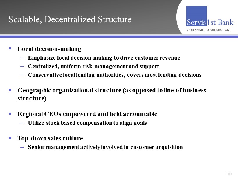 Our Business Model ▪ “Loan making and deposit taking ” – Traditional commercial banking services – No emphasis on non - traditional business lines ▪ Culture of cost control – “Branch light ”, with $287 million (1) average deposits per banking center – Leverage technology and centralized infrastructure – Headcount focused on production and risk management – Key products; including remote deposit capture, cash management, remote currency manager – Outsource selected functions ▪ C&I lending expertise – 42% of gross loans – Target customers: privately held businesses $2 to $250 million in annual sales, professionals, affluent consumers 9 OUR NAME IS OUR MISSION . 1) Includes branches that have been opened or owned for a minimum of one year as of December 31, 2015